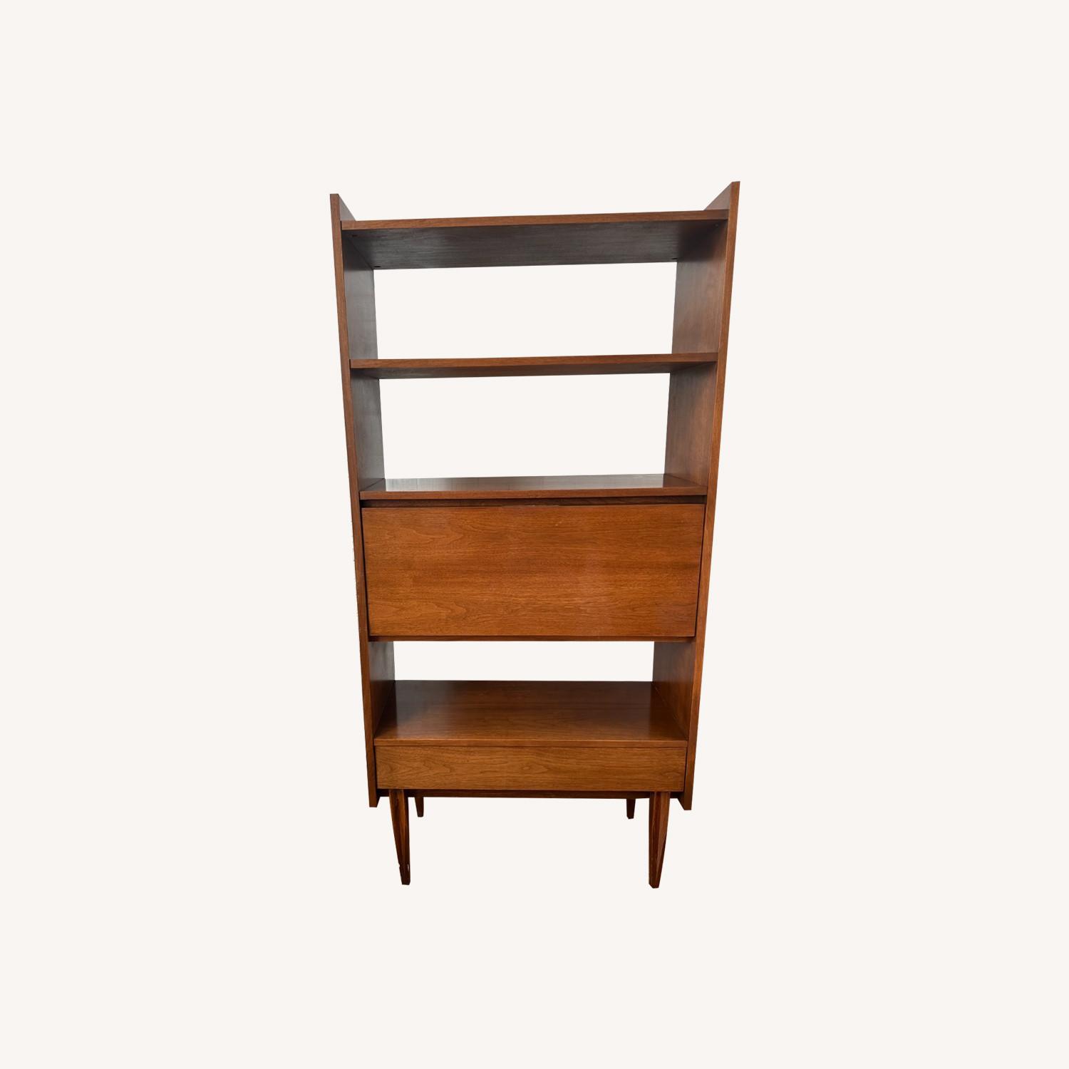 Seller's Notes:A mid-century modern gem in rich walnut which holds more than you imagine with the fold out desk area and bottom drawer. There is a water stain on the top shelf but its not noticable because the top shelf is 67.5" from the ground. Leg clearance is 10.5”. There is some wear in the finger groove where the desk is opened and some small scratch marks on that shelf above the desk due to its vintage age.