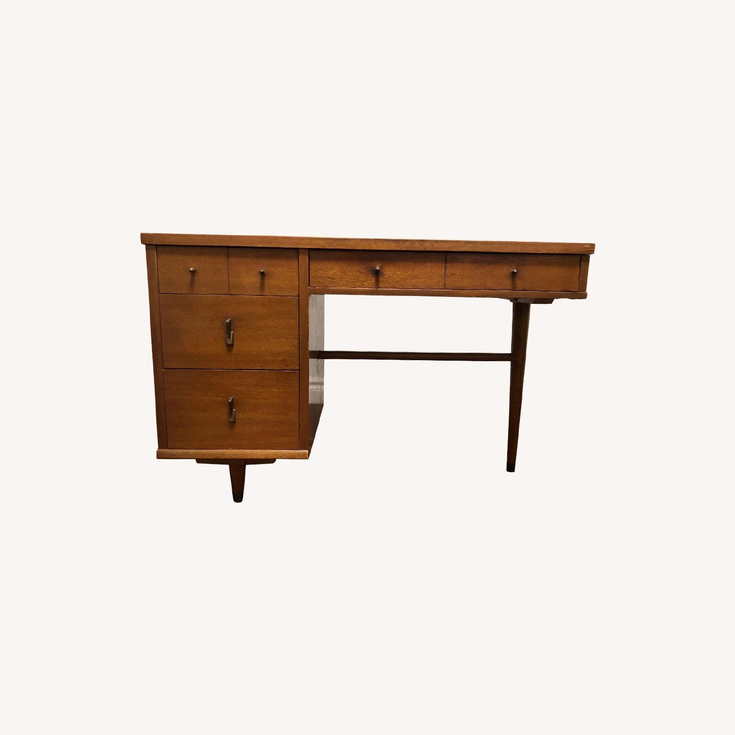Seller's Notes:Vintage Mid Century Modern desk with brass pulls solid drawers and veneer top single sided desk with 3 drawers on the left and a center drawer minimal wear and tear with some scratches on the veneer and a small chip in the veneer at the front solid drawers with antique brass pulls