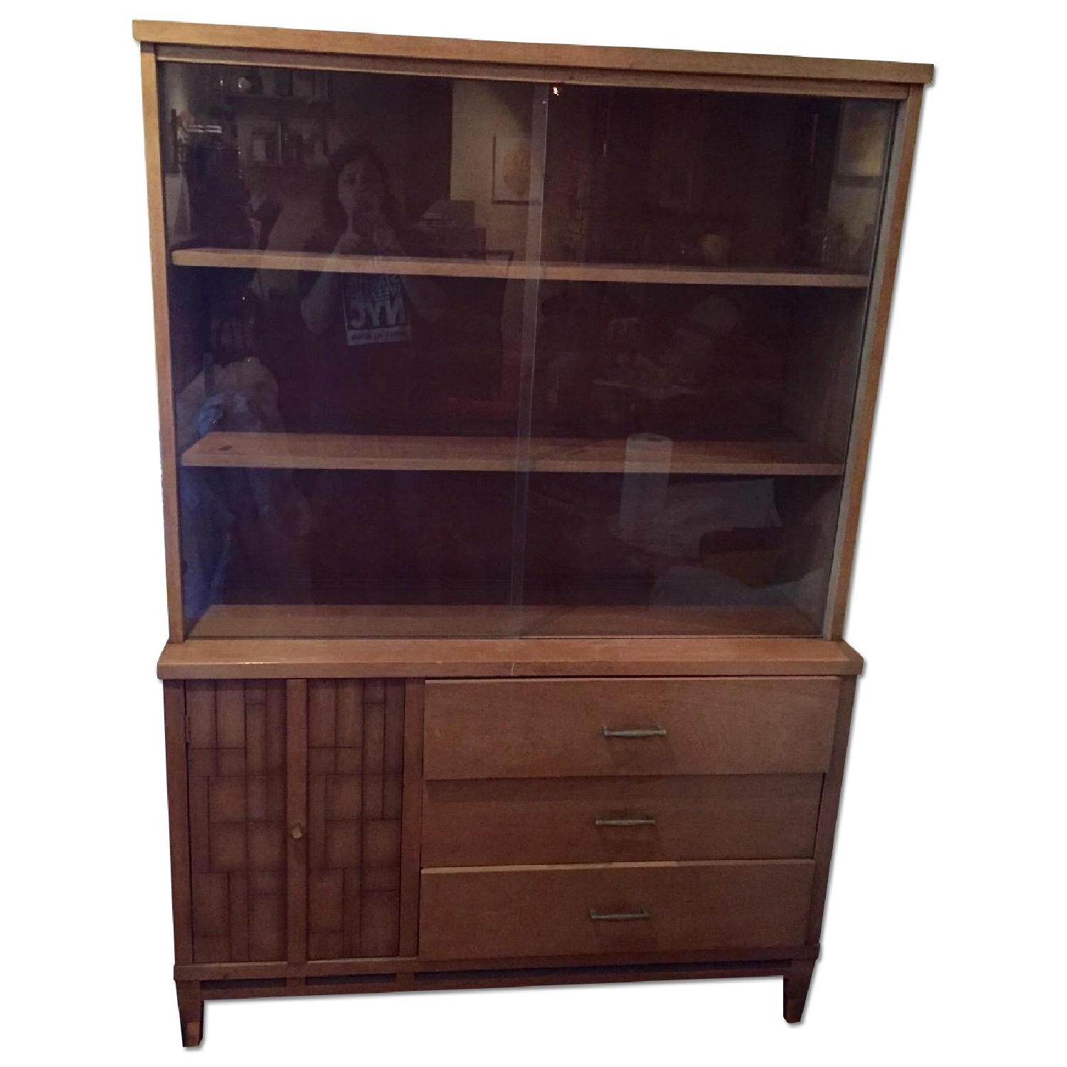 Seller's Notes:Mid century style display case with cabinet and drawers available in East Village. Sliding glass doors to keep your books and trophies dust-free. Cabinet and drawers with vintage paneling and knobs. One of the back legs is a bit broken, but should be able to be easily fixed and isn't visible from the front end.