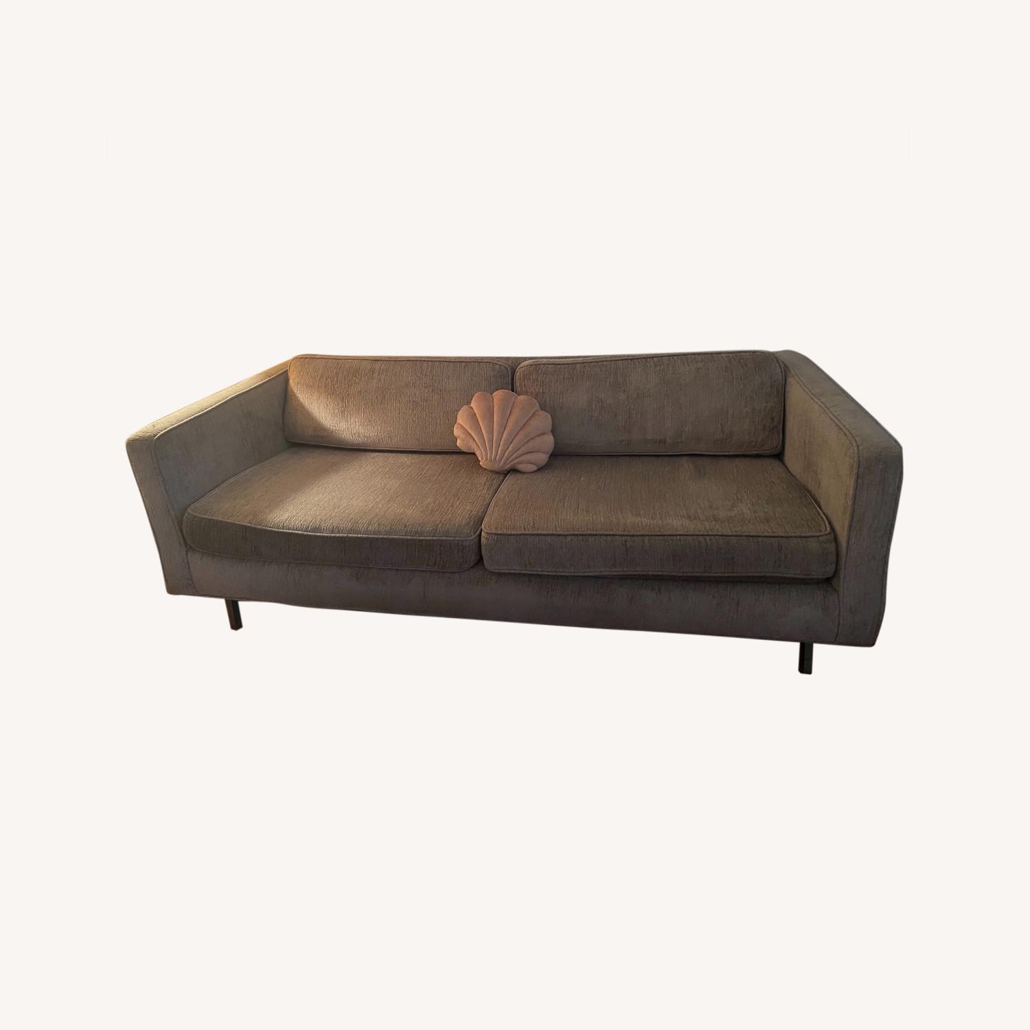Seller's Notes:Vintage Midcentury Milo Baughman-style tuxedo sofa upholstered in sage chenille with chrome & walnut legs. Coming from an interior designer's home, sofa in a great condition consistent with age.