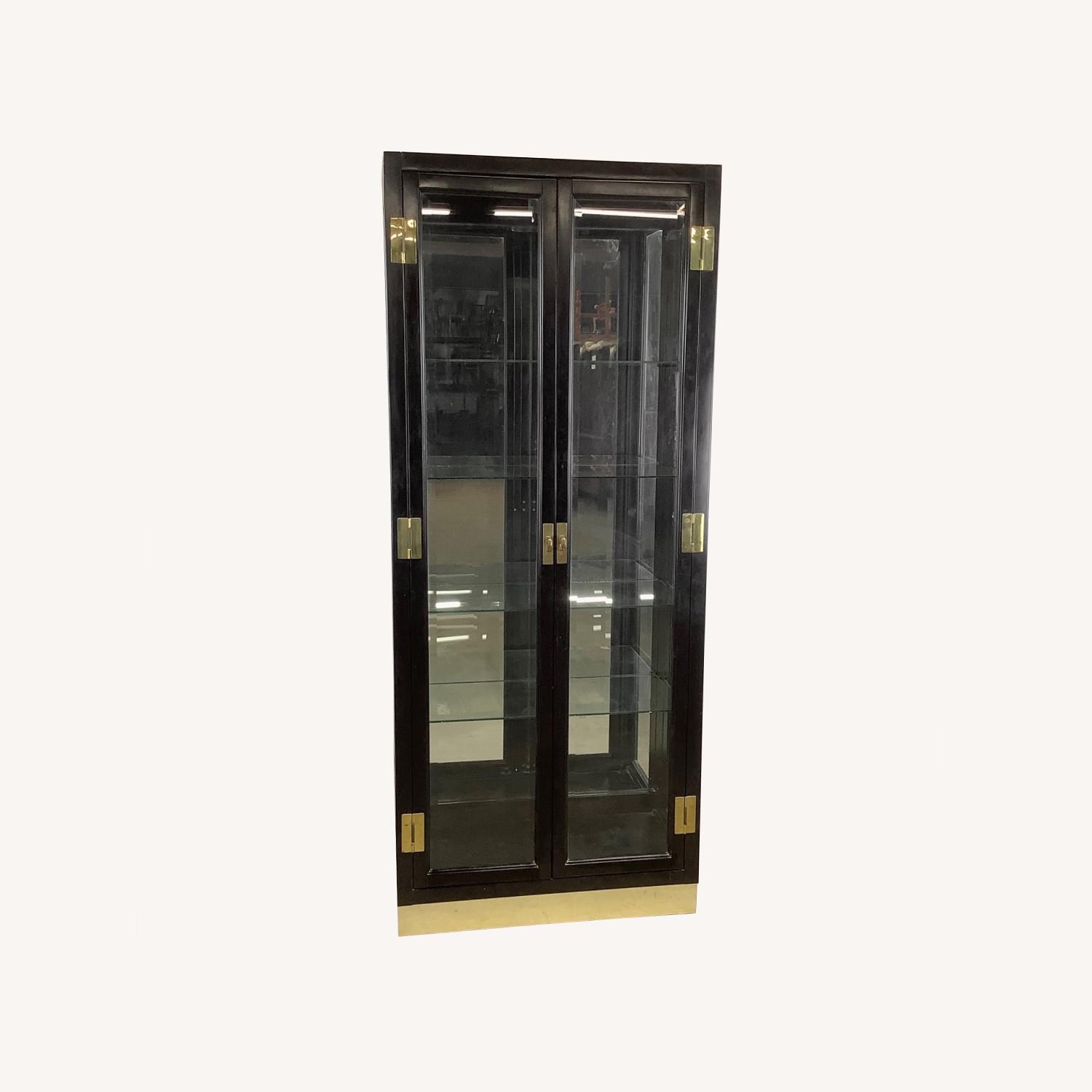 Seller's Notes:This impressive American of Martinsville curio cabinet offers top lit glass display shelves in front of a mirrored back. This tall vintage modern style display cabinet features a vintage ebonized finish with brass detail hardware and trim. Additional matching units can be used separately or together for the perfect display cabinet for home or showroom- contact seller for details. Dimensions: 32w 18d 77h Condition: age appropriate wear, vintage finish worn, scuffs/scratches, edge wear, discoloration/oxidation, dings/chips, glass chips, trim bent, wood loss,interior marks, see photos.