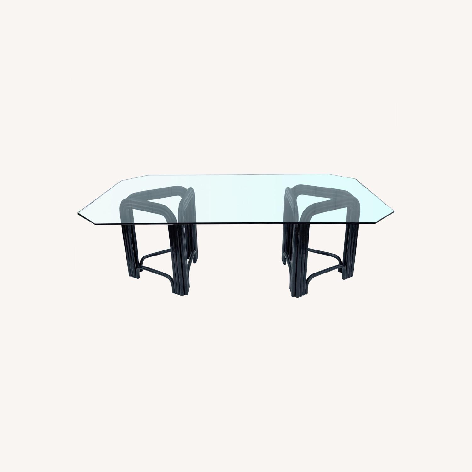 Seller's Notes:This impressive large scale dining table features an expansive bevelled edge glass top table with rattan style. The rattan/bamboo style base is reminiscent of Gabriel Crespi or Paul Frankl and offers understated elegance with a boho modern feel. The impressive size of the table allows for plenty of dining room service in any situation, six matching side chairs also available- contact seller for details. Dimensions: Table: 85w 48d 29.5h Condition: age appropriate wear, vintage finish worn, some scuffs/scratches to glass, discoloration, edge wear/chips, painted finish worn in areas, scuffs/scratches/dings, see photos for details.