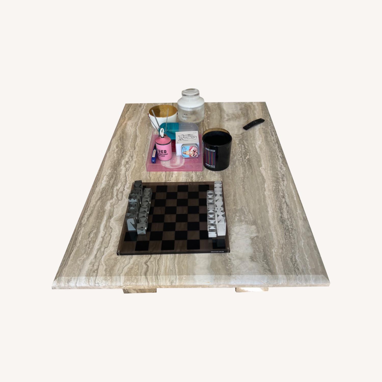 Seller's Notes:Italian travertine mid century modern rectangular coffee table with 4 detachable legs, beautiful travertine stone, very thick solid and heavy , statement piece