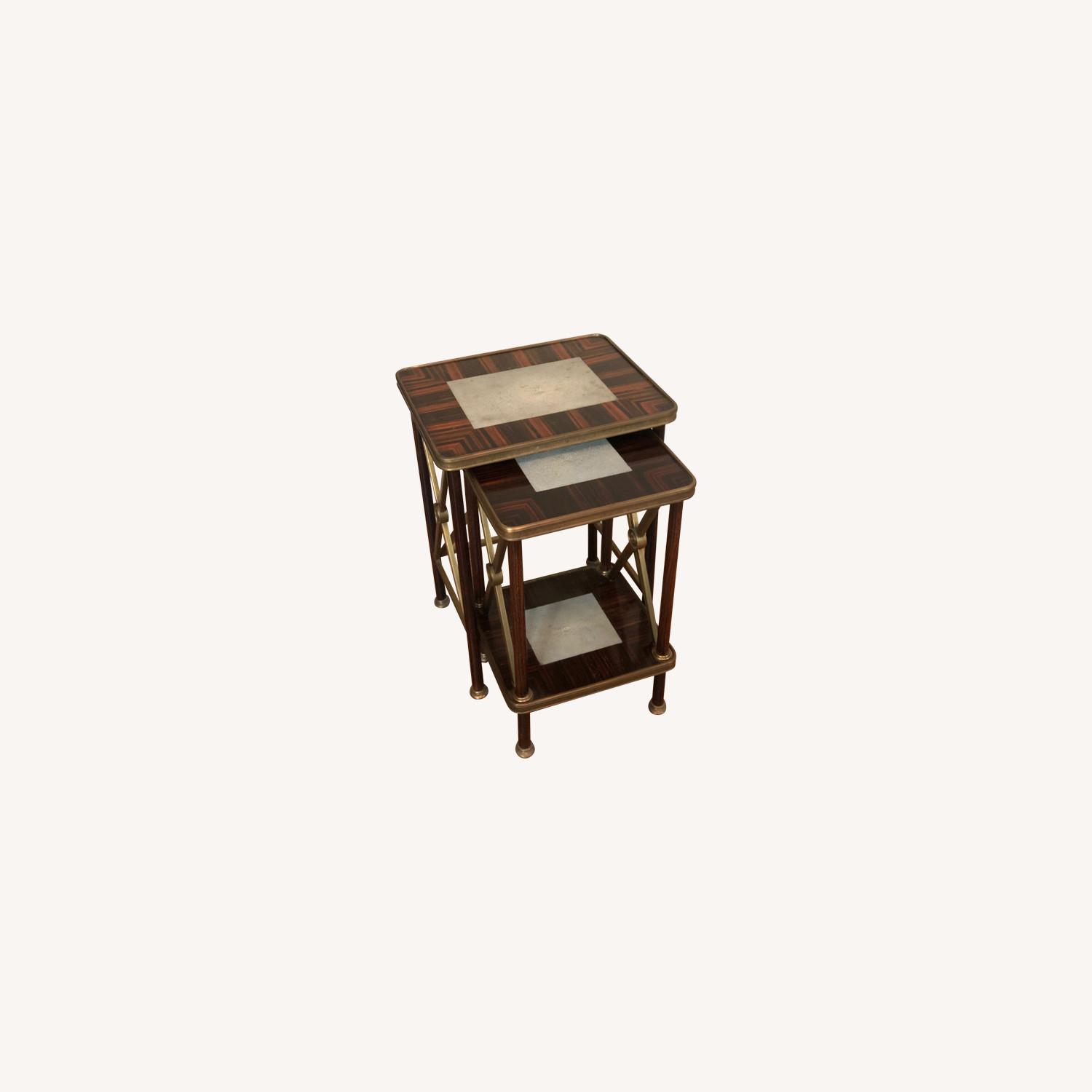 Seller's Notes:This handsome set of nesting tables speak of a European charm, the details make it especially unique, It has a shagreen inlay with a wood pattern veneer in mahogany. The tiger stripe gives it a particularly masculine quality. How can you say no? A wonderful addition to a den or sitting room.