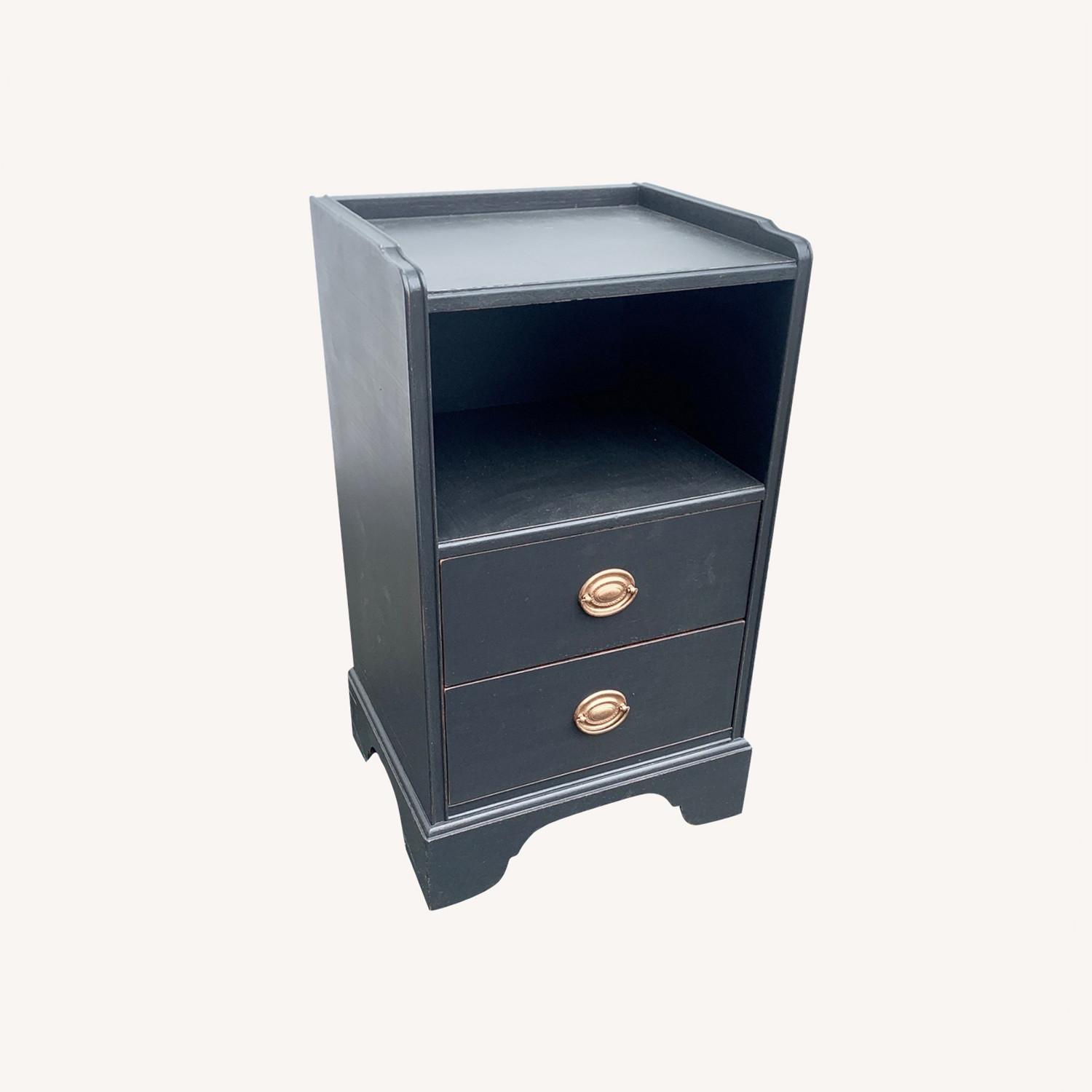 Seller's Notes:Vintage nightstand refinished in black with blue undertones. The edges have been slightly distressed. Featuring a two deep flush faced drawers with shelf above below. Dresser is in a Hepplewhite style dating to the 1940's. It is modestly detailed with a base molding. The original hardware has been updated with a copper gilding wax.