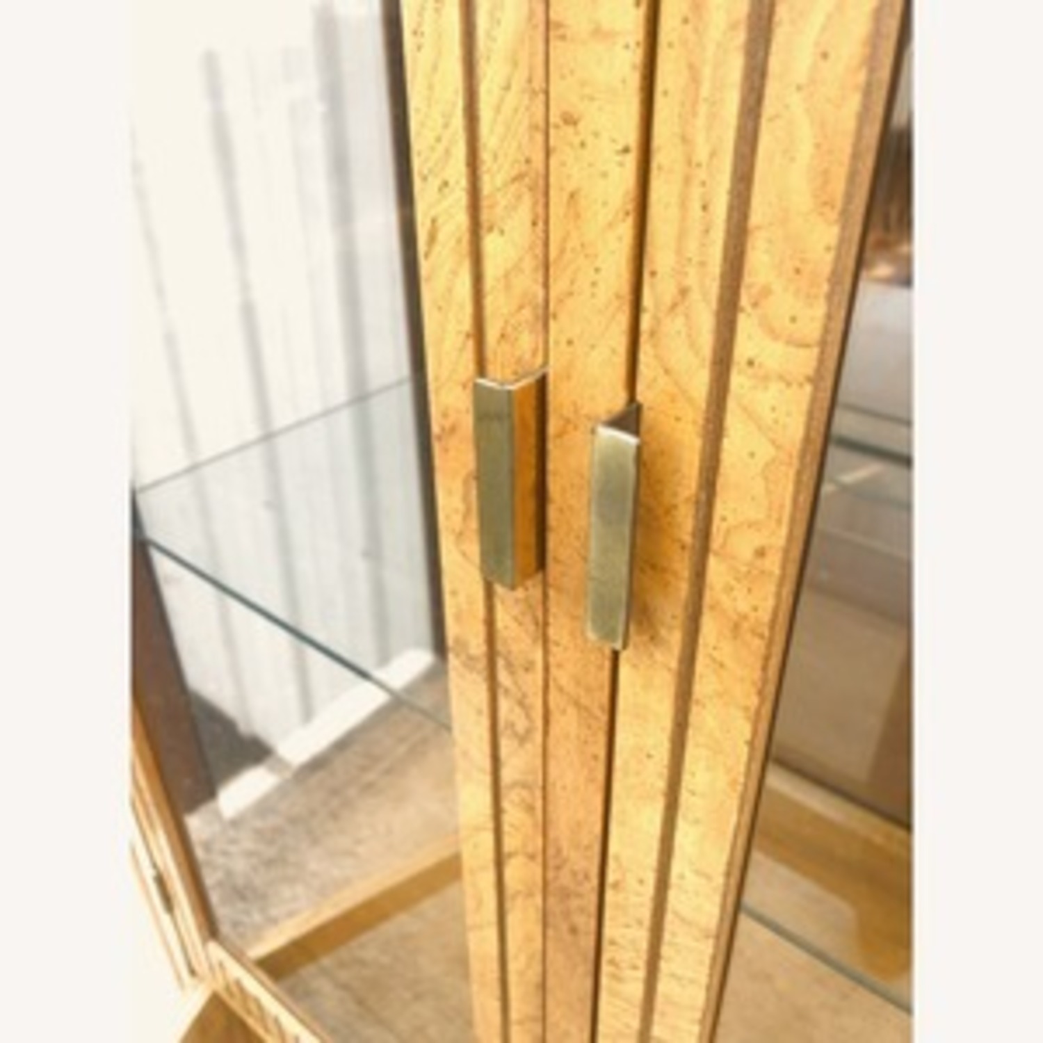 Seller's Notes: This pair of vintage display cabinets feature hardwood construction, original burlwood finish, brass accented trim & hardware, adjustable glass shelves and mirror back panels. The cabinets have lights built in but the cords were cut by a previous owner and would need to be rewired.