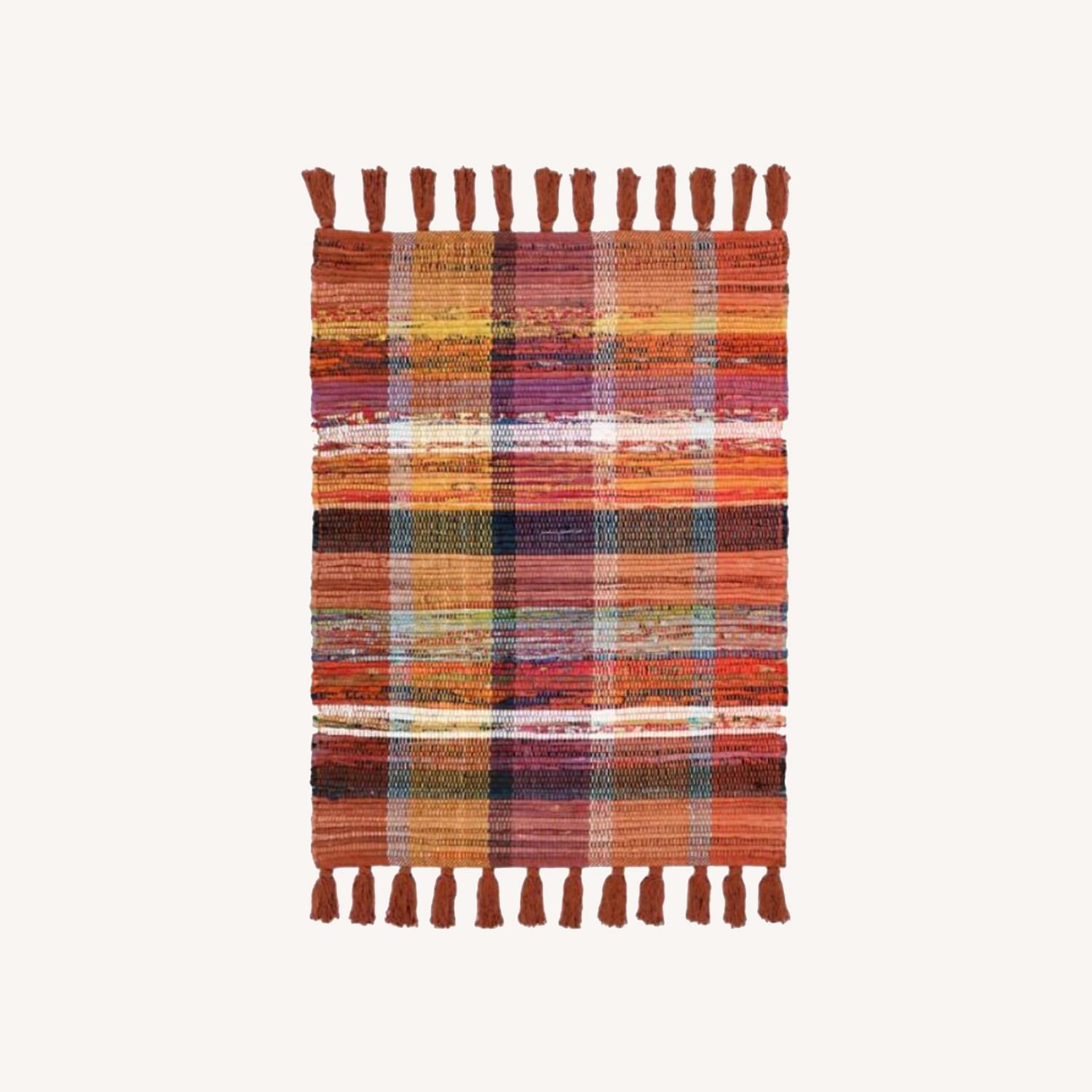 Seller's Notes:This rug features multicolored plaid design with vivid rust-hued stripes. The small 2x3 area rug is crafted of 100% reclaimed cotton and finished with chic tassels. The perfect unique rug for refreshing your kitchen, bathroom and other small indoor spaces, this exclusive accent updates any room with a bold splash of colorful woven patterning. I'm open to offers much lower than $50!