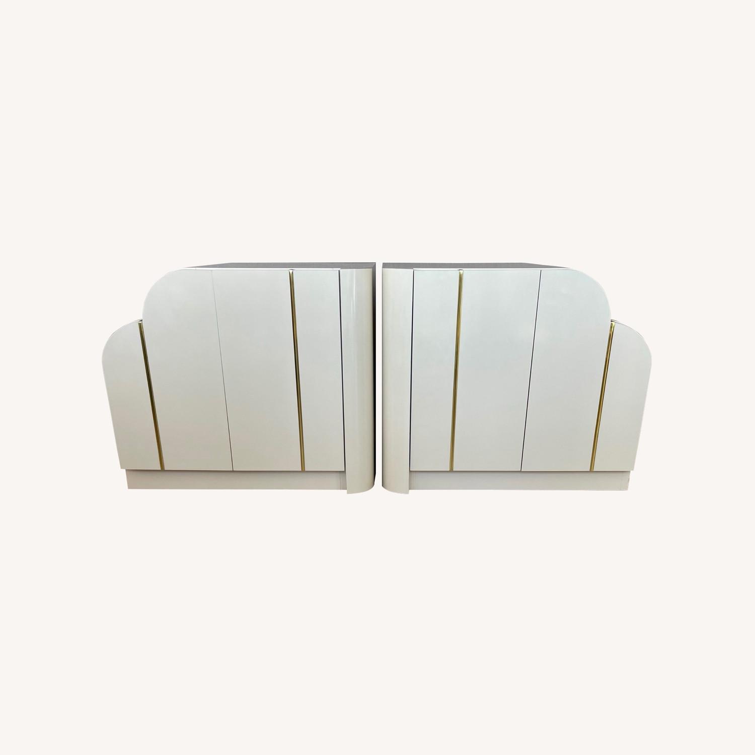 Seller's Notes:incredible custom ivory laminate double waterfall side tables with gold accents. each has a shelf inside (one needs more pegs to hold the shelf) or remove the shelf altogether which would provide more functional storage. great vintage condition, a couple of small flaws that aren’t noticeable unless you’re looking for them. dimensions: 27” at widest point, 24” high, 19.75” deep.