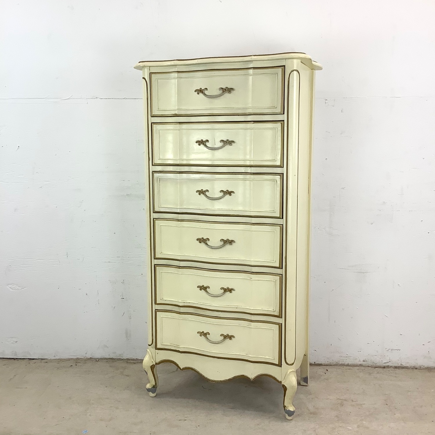 Seller's Notes:Timeless design and clever function meet in this vintage French Provincial lingerie chest, an elegant storage piece with six drawers stacked in a tall, narrow silhouette. With its distressed finish, curving lines, and ornate details, this chest balances delicate beauty with everyday practicality. The chest’s cabriole legs and scalloped base offer a subtle nod to Rococo influence, while the elongated frame keeps the overall profile airy and refined. The curved front and decorative carvings lend visual interest from every angle. Its soft off-white paint has been artistically distressed to reveal layers of texture and history beneath. The lightly weathered look highlights the chest’s contours and suggests generations of use and love, ideal for vintage-inspired interiors. Each drawer features classic French-style hardware—decorative metal pulls with intricate curves that complete the chest’s period-authentic look. They provide easy access while reinforcing the chest’s sense of elegant utility. Though delicate in appearance, this piece offers ample storage in a slim footprint. Whether used for storing lingerie, jewelry, small linens, or accessories, its vertical design helps make the most of tight spaces. Add it to a bedroom, bathroom, or entryway where both style and space matter. This lingerie chest transforms everyday storage into an experience of timeless European charm. Dimensions: 27w 15d 52h Condition: age appropriate wear, vintage finish worn, scuffs/scratches, edge wear, discoloration, interior marks, chips, stains, see photos.