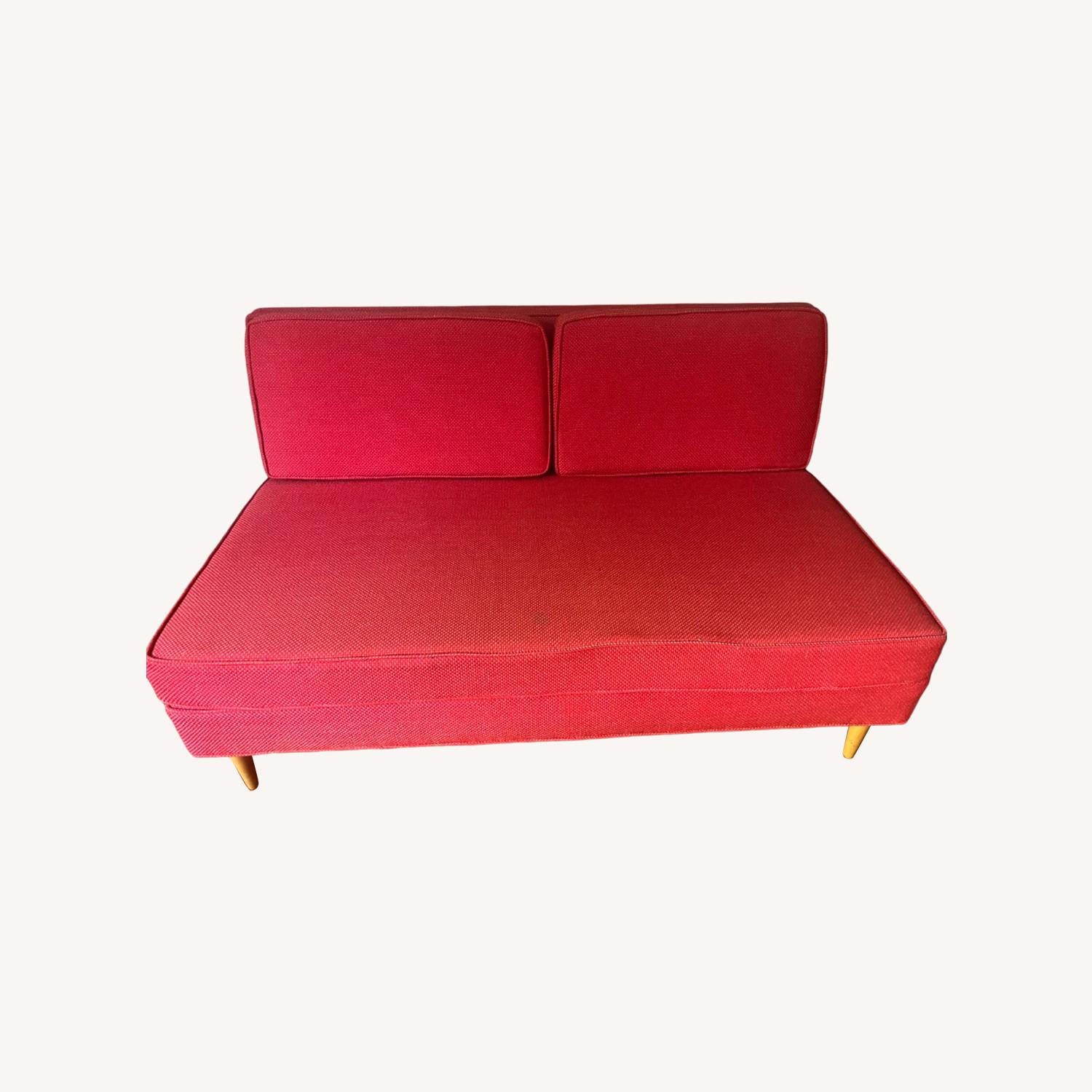 Seller's Notes:Red 2 Seater Sofa with purple woven detailing. Most likely bought in the early 80's but still has little to no damage.
