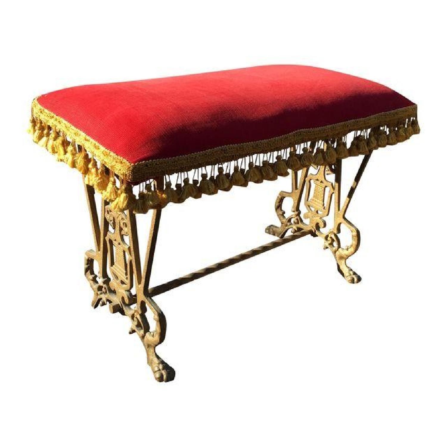 Seller's Notes:Give yourself the royal treatment with this magnificent vintage piano bench draped in red with gold tassels. With 1940's styling, rescued from a Hudson Valley estate, this bench boasts ornate metal legs.