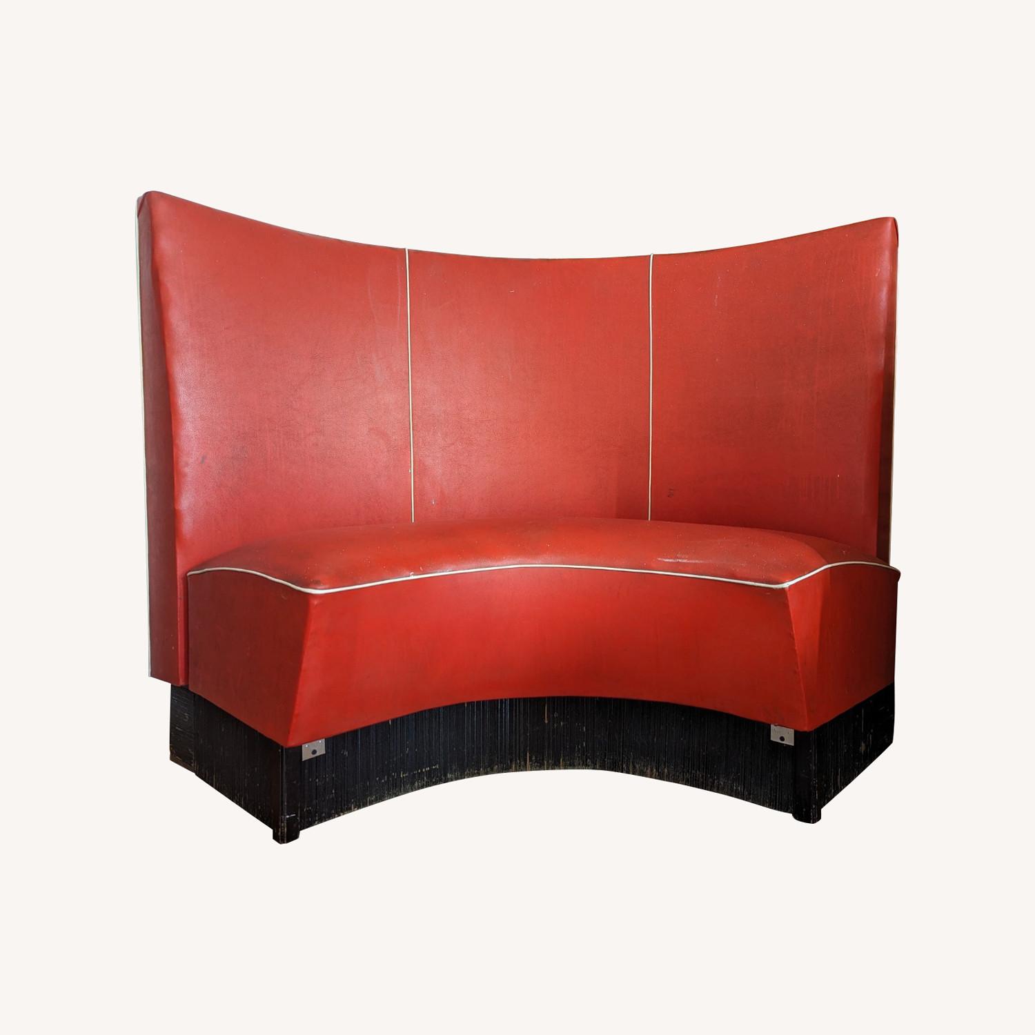 Seller's Notes:Red Leather Curved Restaurant Booth. Purchased at an estate sale over 10+ years ago on Long Island. Original Booth from a restaurant, preserved until purchase. Wood construction with leather wrapping and hammered details. Disassembles for easy maneuverability.