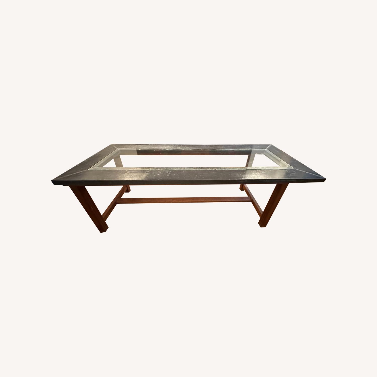 Seller's Notes:Hard wood, zinc, glass; 86 3/4" x 31 5/8. A unique and handsome table that would work well in decors ranging from antique to modern.