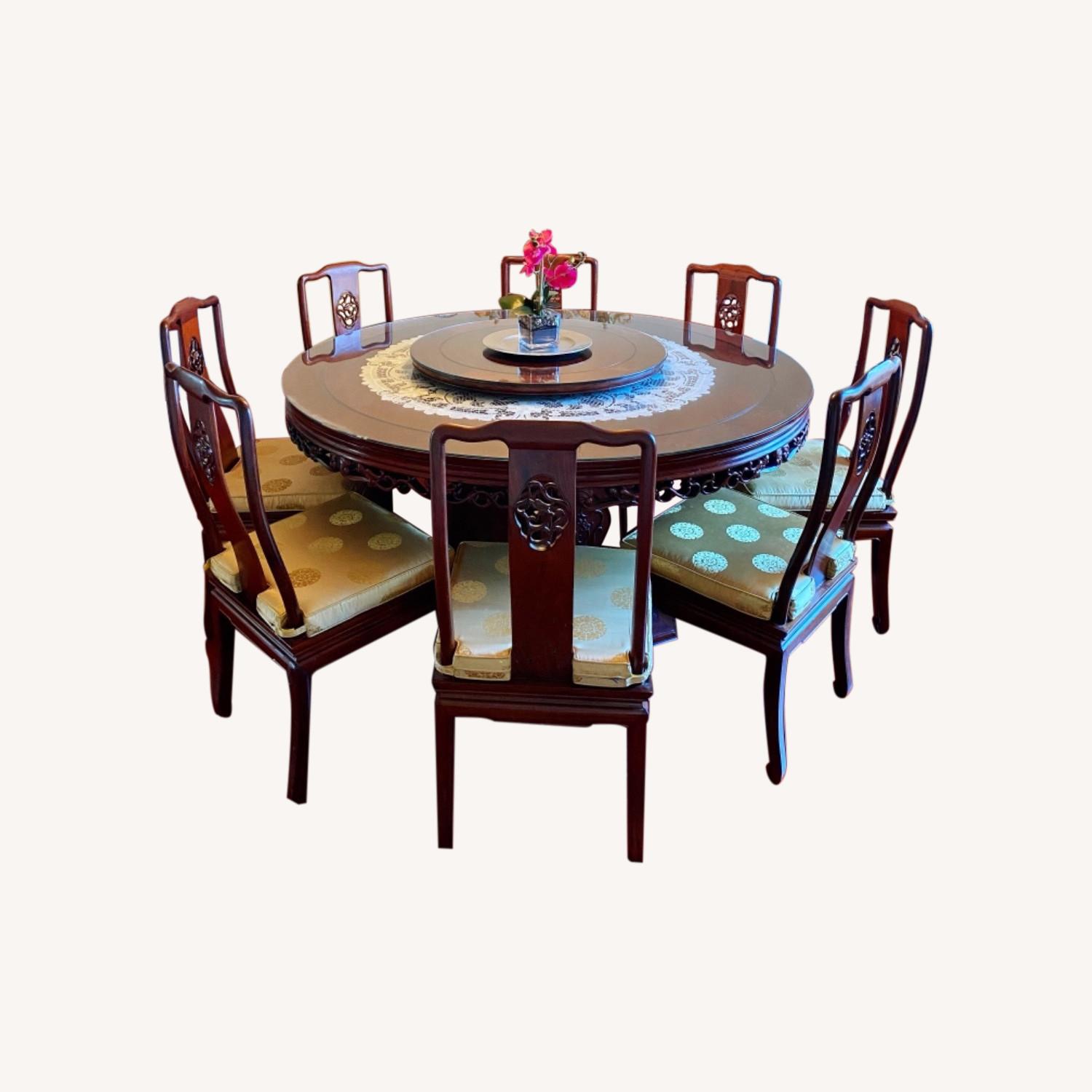 Seller's Notes:Vintage Rosewood (Dalbergia) Carved Dragon Dining Set. 60 inch solid rosewood glass top table, with 8 matching chairs 17 inch W x 17 inch D with cushions, and glass top 30 inch lazy susan. Table base has storage area. Set is situated on the first floor of a non-smoking single family home. Set was custom handmade in Hong Kong and shipped here 30 years ago.
