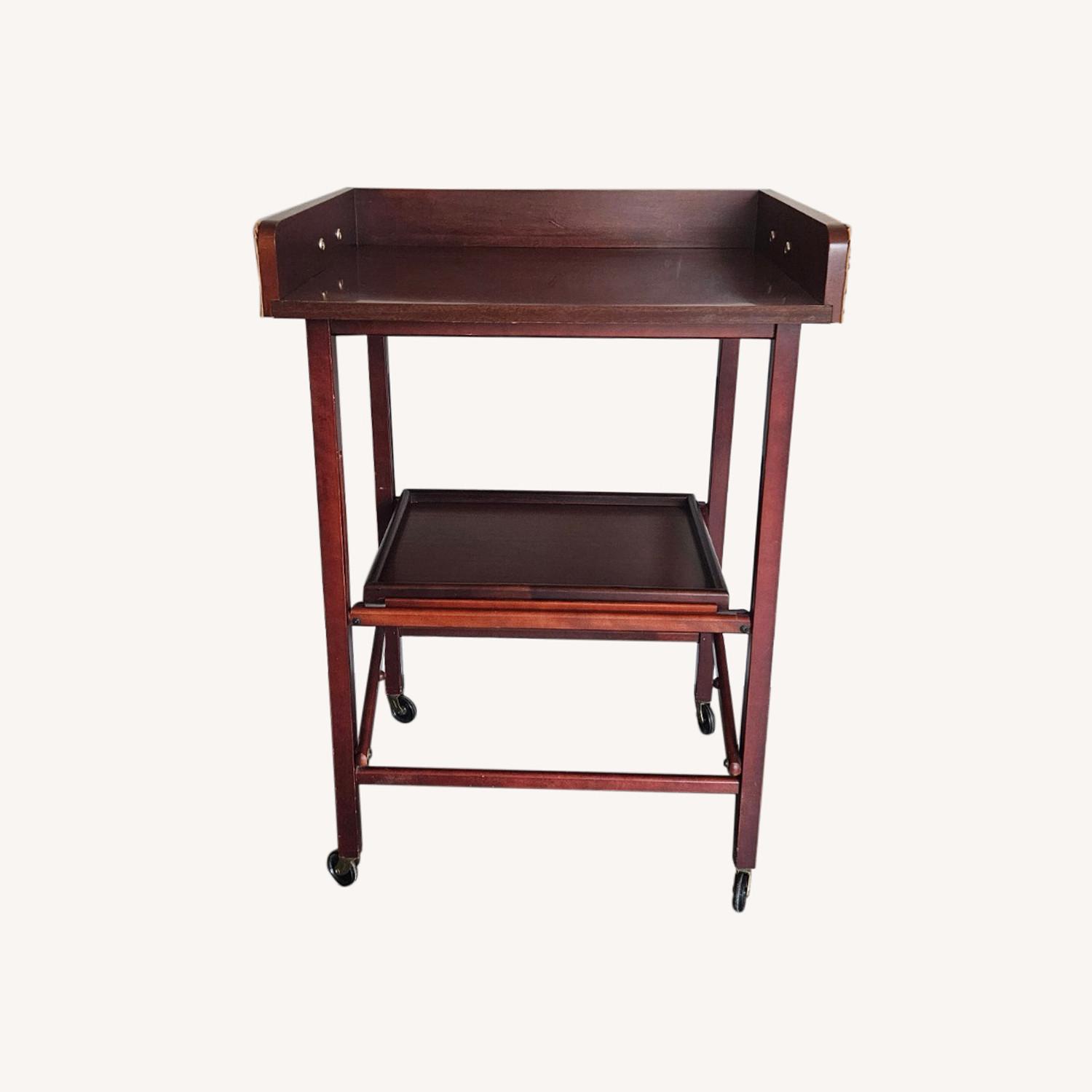 Seller's Notes:For sale: ORIGINAL MID CENTURY SCHEIBE FOLDING ROLLING BAR CART WITH 2 TRAYS. This is a beautiful piece! Solid wood folding rolling bar cart with two portable trays. Both trays can be removed from the cart. No need to worry about any spills damaging the wood, both tray tops are covered in the original vintage wood grain Formica which is washable, resists stains and scratches. Everything is in very good vintage condition with minimal wear for the age and use. The cart is sturdy, folds, unfolds and rolls easily. Scheibe Products Label on back of larger tray. Dimension when set up 29w x 36" tall x 18" deep Top tray: 29" w x 3 1/4"tall x 18" deep Lower Tray: 18" w x 1" tall x 13 1/2 deep Dimension when folded 22" w x 32" tall x 6" deep All Scheibe products are made in the USA and you will not find a better made space saving Mid Century Rolling Bar Cart.