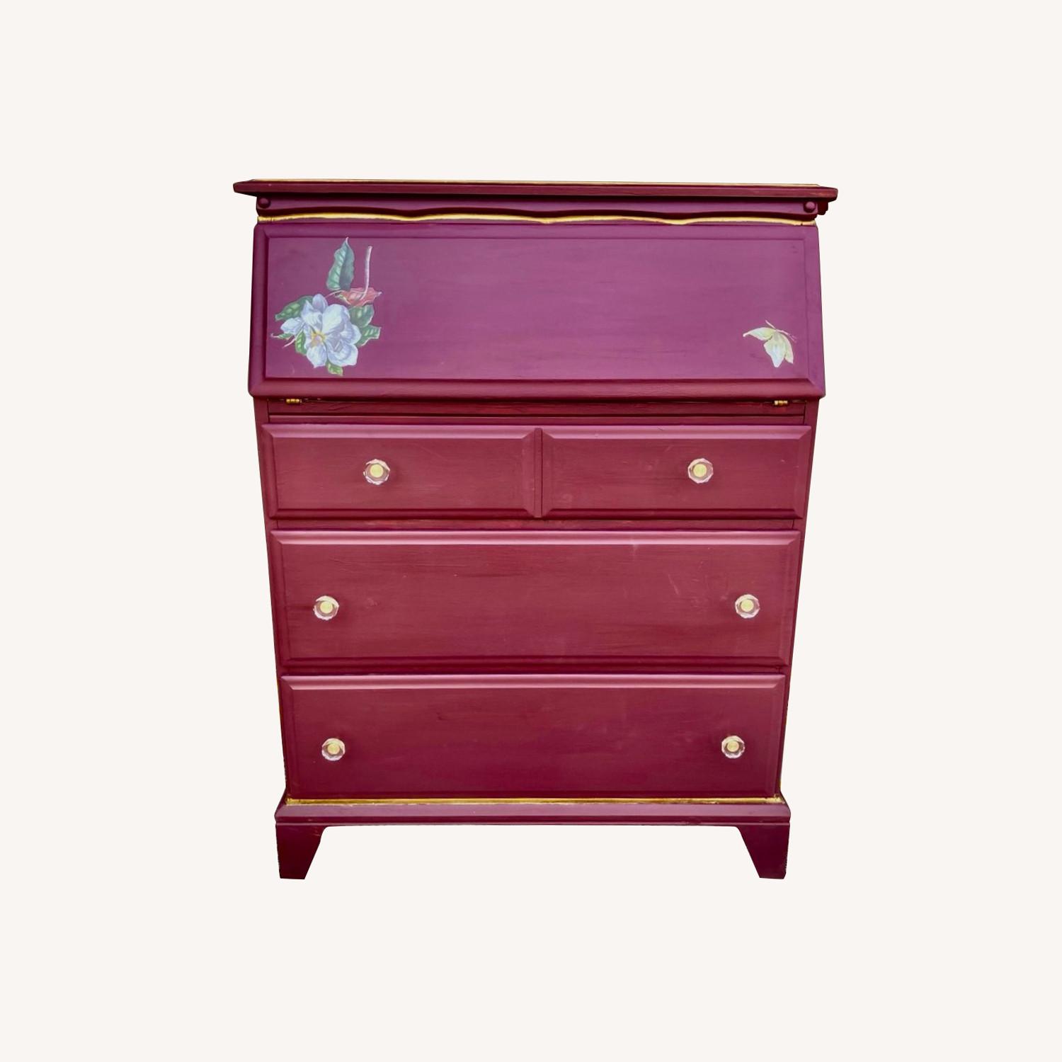 Seller's Notes:1969 Solid wood secretary with fold-out work surface and 3 spacious drawers for storage. Beautifully refinished, professionally, with quality paints and topcoat. Interior boasts a pink paint, letter slots, and decor of magnolias are found strategically placed throughout, including on drawer sides. Color is Elderberry (a light burgundy). Tasteful gold trim.