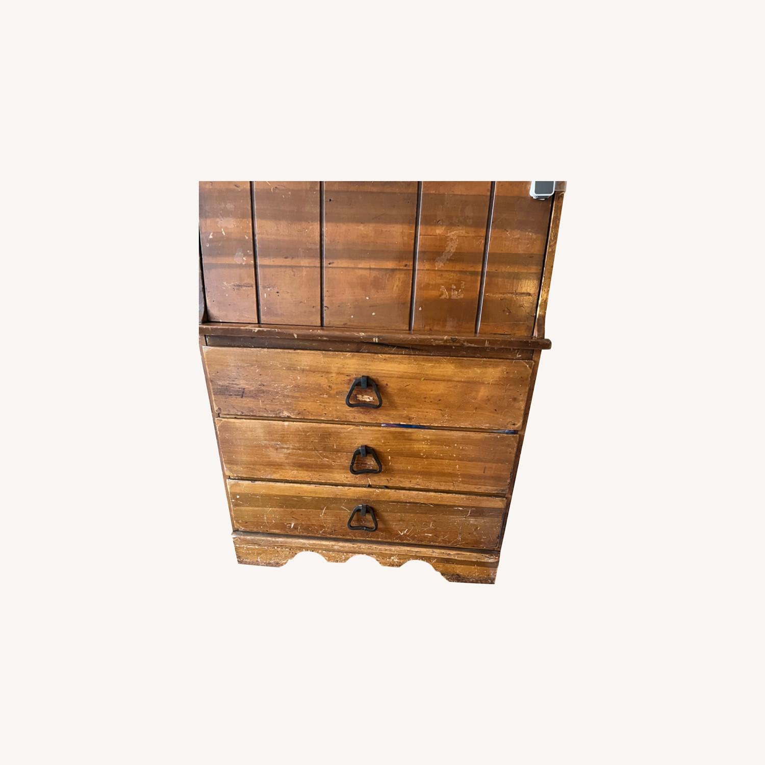 Seller's Notes:Gorgeous secretary desk with three drawers. Closes for storage/tidier look, and opens to use as a desk. We have added a hole for cords in the back to keep electronics tidy. Well-loved, distressed look.