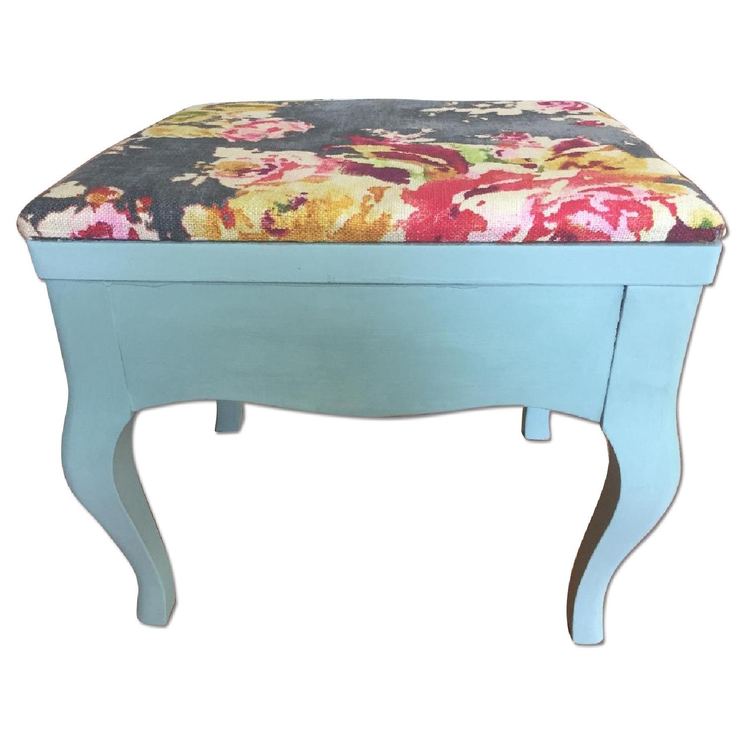 Seller's Notes:Vintage sewing stool, freshly painted and reupholstered. Has original wood dowels inside for storing thread. Perfect for additional storage in a bedroom or as a small ottoman in a living room.