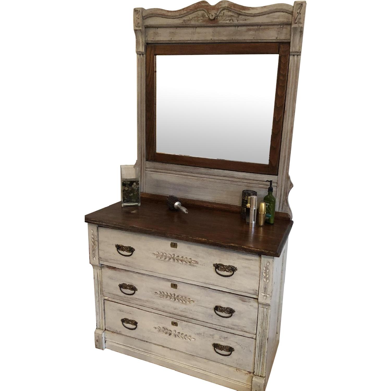 Seller's Notes:Lovingly restored vintage oak dresser with mirror that detaches for easy moving. Carved original details and pulls makes this a beautiful and highly functional accent piece that fits well in any pre-war building. Drawers are deep and hold a lot. Off white chalk stain (antique white) with dark oak top and mirror trim. Scratches are deliberate and part of Shabby Chic Style.