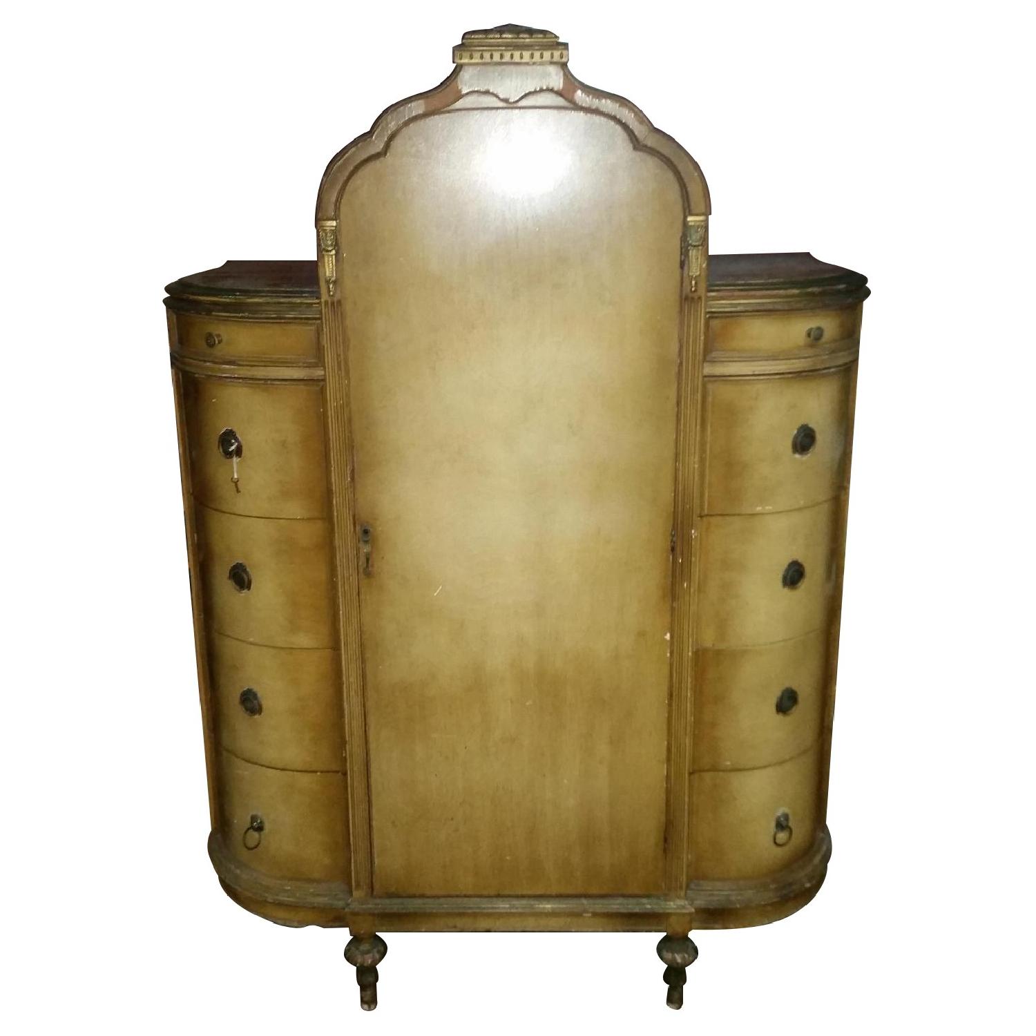 Seller's Notes:In an effort to streamline our living space, we are going to put this wardrobe up for sale. It's a little careworn, so if you are looking for something in that "vintage" and "shabby chic" look, then this is your piece. This wardrobe was acquired by my grandparents are left to me after they passed. The original hardware on the lower drawers were replaced with the lion head pulls before it came in to our possession, as was the original locking mechanism. There's chipping on parts of the finish all over and two sections of veneer are missing from the frame over the door. I think my grandfather tried to repaint some of the details at some point. Because of that there is some discoloration on the legs. The piece is a very solid and well built and measures 65.5" H x 23" D x 47" W. There are ten drawers in total. Eight of them are very roomy at 7.5" H x 19" D x 9" W. The other two have the same depth and width dimensions, but are only 2" high, making them great for jewelry storage. The closet is 51" H x 21" D x 20.5" W and features a J.T. Batts pullout rod.