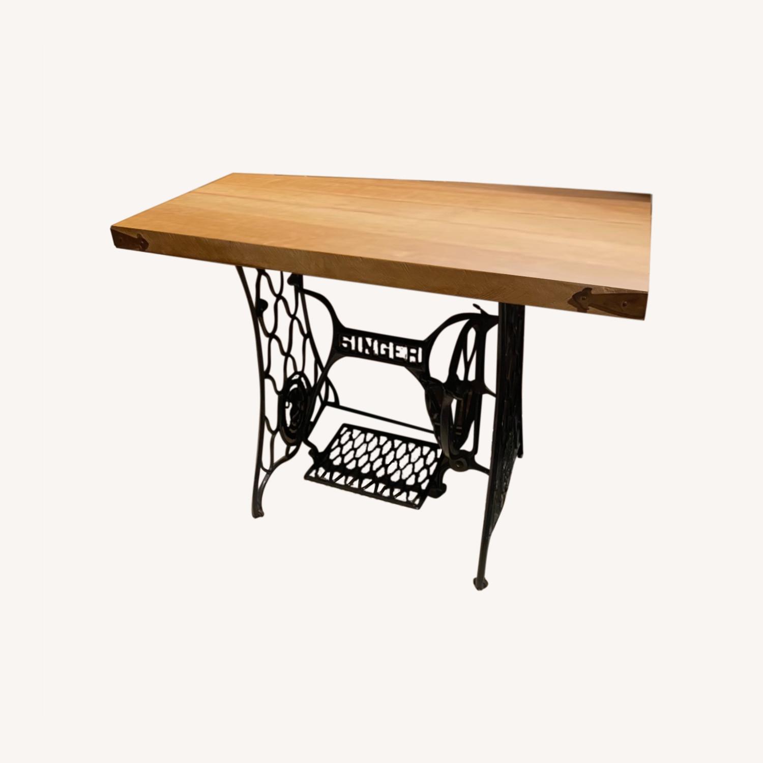 Seller's Notes:Thick, solid wood top. Decorative solid iron brackets on each corner. Black solid iron Singer sewing machine base. The sewing machine base is also fully functional; the treadle still turns the band wheel, belt shifter still present and functional. You typically can’t find these for under $500 - this is a steal! Item is in great condition with no major signs of wear. Will only continue to look better over time! Nothing in the photos is included but the desk itself. Dimensions: 40 W x 18 D x 30 H