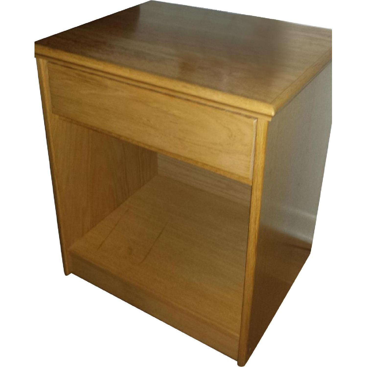 Seller's Notes:(Apt Deco Verified!) This simple end table is constructed of solid wood. It is worth reiterating: this end table is VERY solid. In today's dollars, this item was purchased for ~$425 new. It was purchased over 10 years ago and lightly used. It has a minor stain on the bottom shelf which would probably come out with a little Old English, and a minor blemish on the top right corner due to moisture. See the pictures: neither are noticeable when in-use. (We have had magazines or a laptop on the bottom shelf)