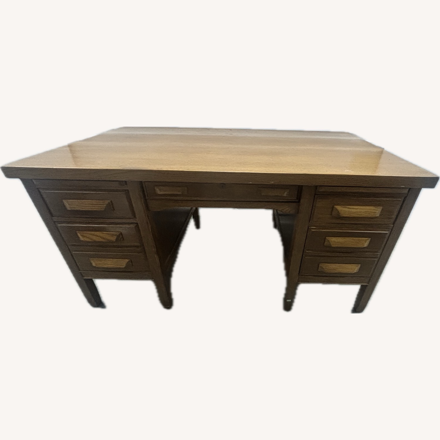 Seller's Notes: Beautiful vintage Mid-Century Modern executive desk with sculpted wood drawer pulls and classic dual-pedestal design. Solid wood construction, dovetail drawers, and warm walnut tone. Nine drawers provide generous storage, including deep file drawers. This piece features clean architectural lines, tapered legs, and a substantial top — the perfect blend of Mid-Century craftsmanship and timeless style. Ideal as a home office statement desk, studio workspace, or stylish executive setup. Solid wood build Sculpted drawer pulls Nine drawers Excellent structure and finish MCM / Danish modern inspired design Condition: Great vintage condition. Minor wear consistent with age, adds to character.