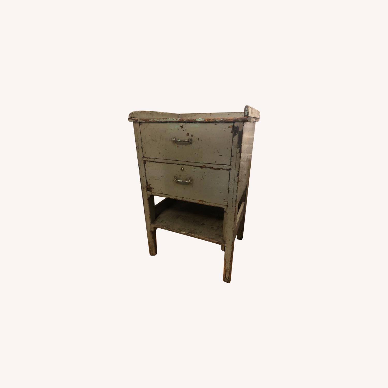 Seller's Notes:Vintage industrial standing desk from a shuttered machine shop in PA. Would make a great host station in a restaurant, or a small storage unit in a home. Two drawers, one open shelf. Top is edged on three sides. Great condition for the age, paint is original, lots of character.