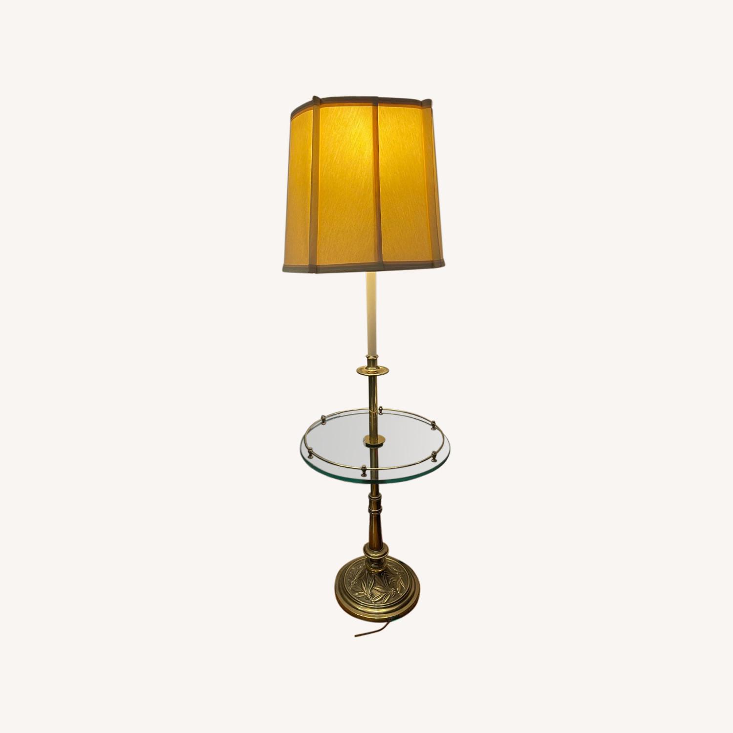 Seller's Notes:Excellent standing lamp with glass table. The perfect addition to any home. Gold base and railing on glass. Original lampshade in great condition.
