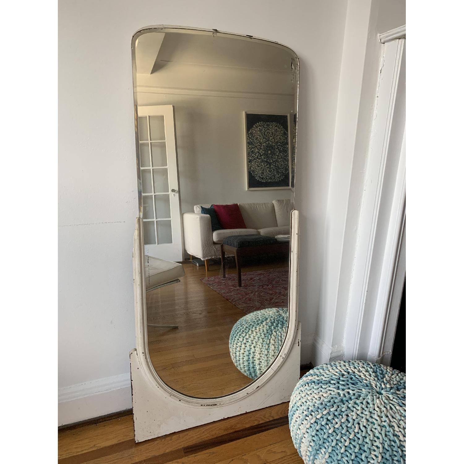 Seller's Notes:Vintage mirror made to lean against the wall. The wood has a distressed look but can be painted easily. This is a very old piece but serves as a great floor length mirror. Unique and one of a kind, from a smoke- and pet-free home.