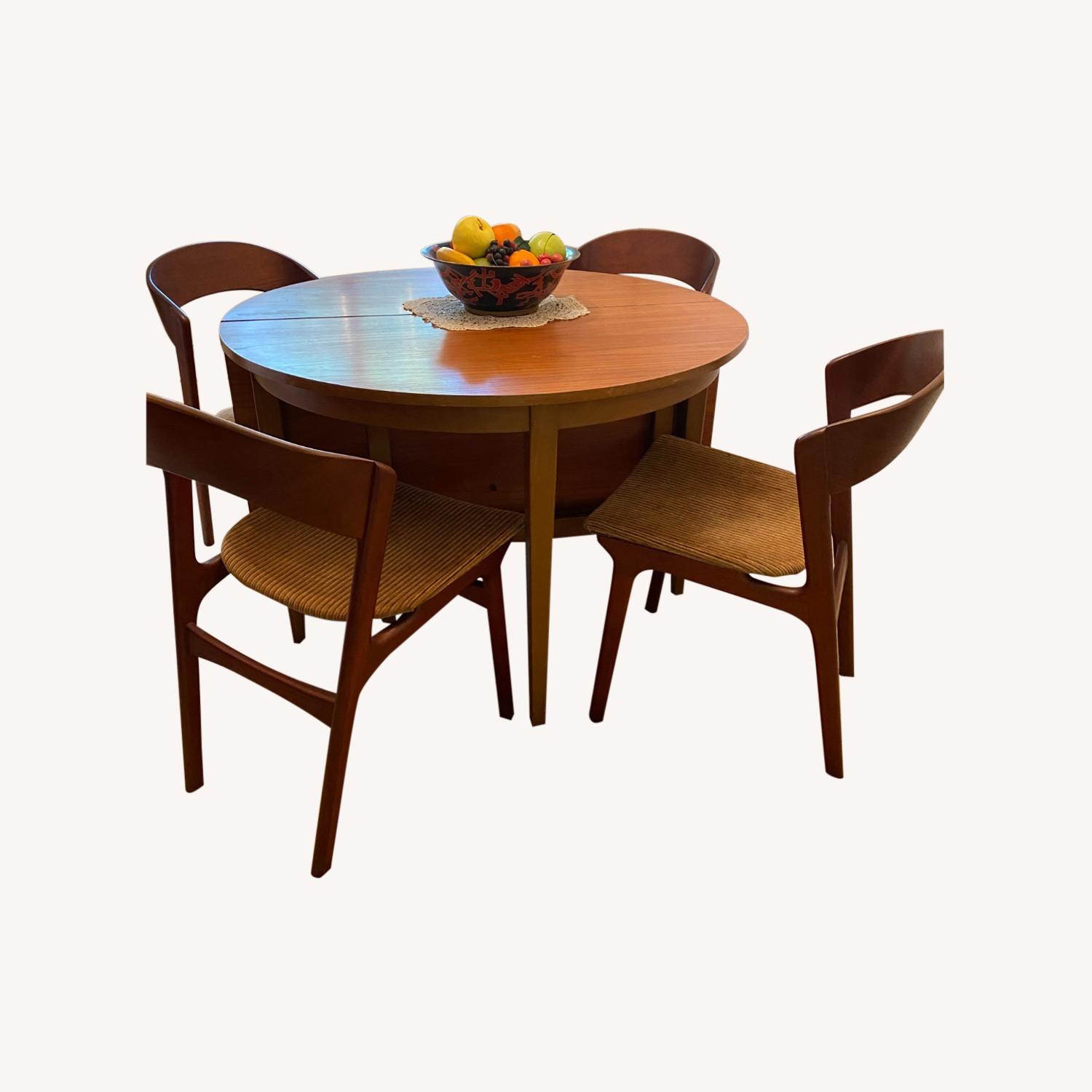 Seller's Notes:Danish Teak set. Bought in 1960. Original owners. Opens to 86 1/2 oval. 4 chairs that have been recovered but the wood is in excellent condition.