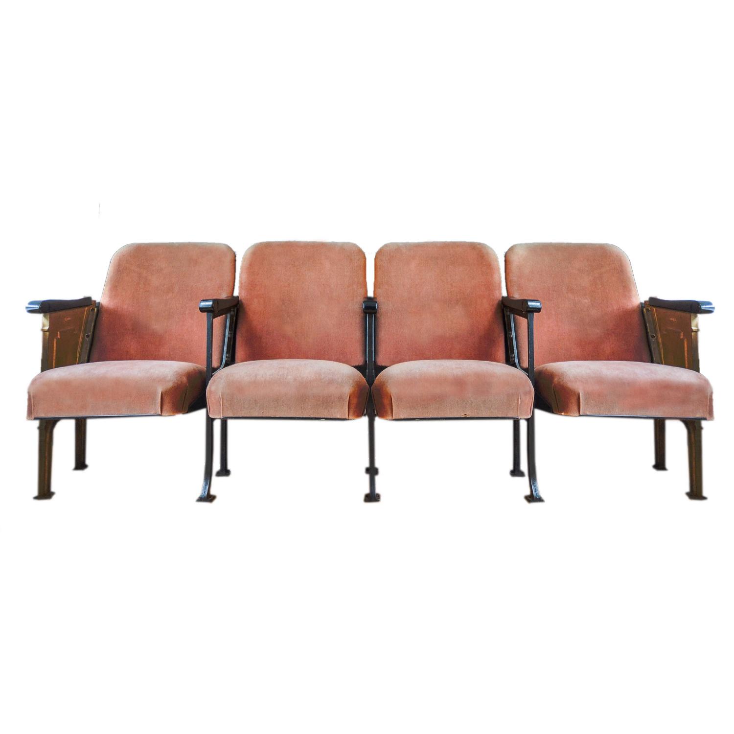 Seller's Notes:Pink velvet theater chairs in good condition. These seats are crafted of metal with wooden arms. The chairs were salvaged from an old theater and the four chairs are currently joined. The chairs are labeled row 100 and stamped with seat number 339, 340, 359, 345. There are two small holes in the velvet fabric (less than 1/2" in size) found on the seat cushions near where the fabric joins the bottom. The velvet nap has become a little worn and faded at the front of the seat cushion and along the top of the back of the chair. There are some scratches on the back and base of the chairs that could easily be painted if you choose to restore the chairs but they are gorgeous in their vintage state as well. The middle back leg also has a small bend but could be reinforced - the bend does not alter the stability of the chairs as a whole. Chairs can be positioned with a slight curve to adjust the full length. I was told by the original seller that they can be separated and recombined but I have not personally tried this. Measurements when combined and straight - 84.5" L x 33" H x 27.5" W - Seat height 18" These chairs were manufactured by Ideal Seating Company, Grand Rapids Michigan. They will add character and vintage charm to any home or apartment and will surely make a statement!