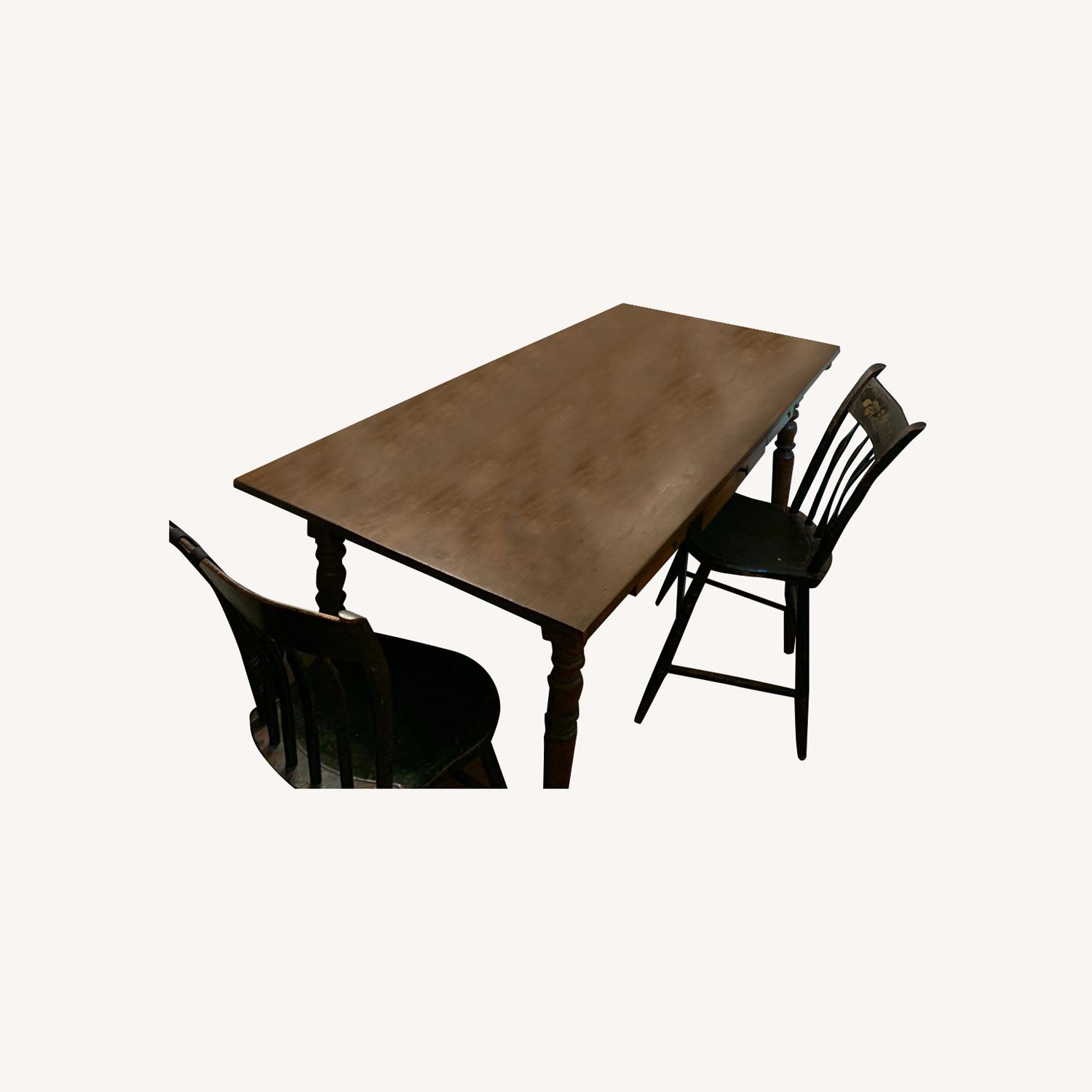 Seller's Notes:This desk was purchased in a vintage store in Santa Fe, NM. I've used it both as a desk and as a dinning table. It's handy as a dining table in NY because it is narrower than most but can still easily fit 4+ people. It has three large interior drawers, two deep 9.5 inch wide drawers and one 17.5 wide center drawer. Perfect for additional kitchenware storage or work/miscellaneous items. The legs can be removed by a large wooden pin so getting it in and out of an apartment is made easier. Likewise the top of the table can be removed. It is currently already partly disassembled to make pick-up more convenient. Easy to care for: I use some wood oil every now and then to keep the wood looking and feeling nice. Beyond that, normal cleaning supplies work well.