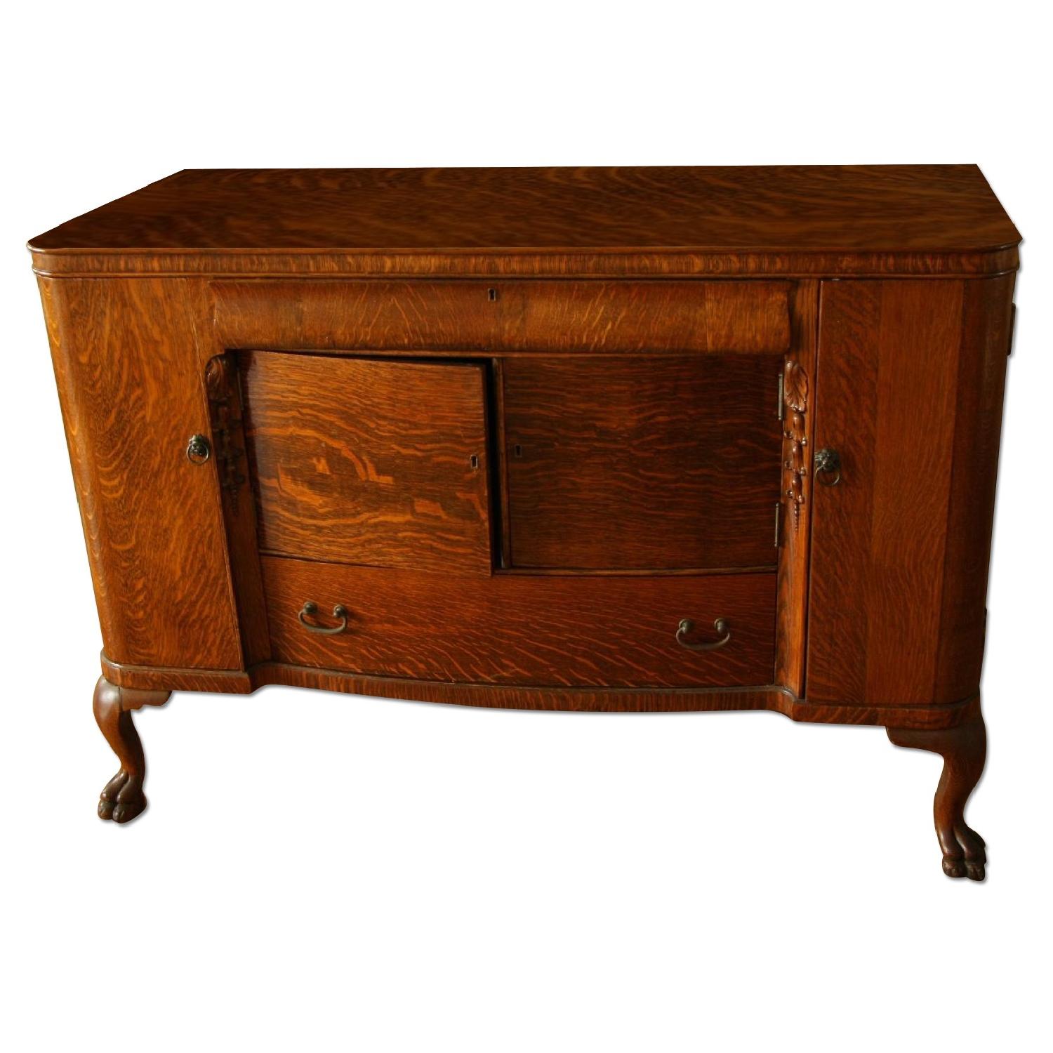 Seller's Notes:Vintage tiger oak sideboard buffet from the middle of last century. No hutch, but a new hutch can be mounted onto it. Has been kept in storage and is in perfect condition, not a scratch on it; however, original hardware is missing from the side drawers and center cabinet, so they swing open unless lifts are slipped under the front legs or new latches are mounted to these drawers. Manufacturer unknown, see photo of deteriorated brand sticker on the back of sideboard.