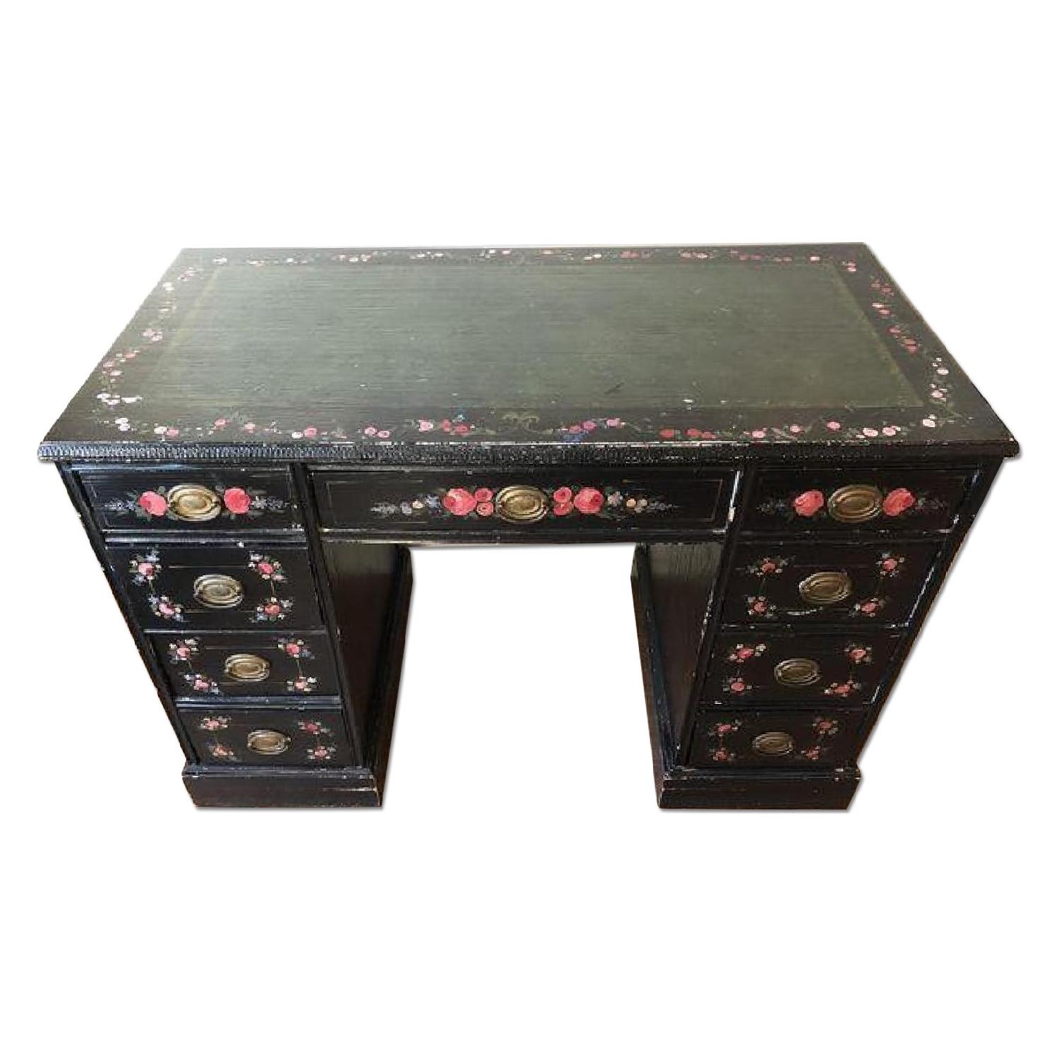 Seller's Notes:Large black vintage wood desk with hand painted flower details. The leg space underneath is a little tight -- it is 19.8 in. wide and 23.5 in tall. There are some paint splotches on top, and the drawers are a little difficult to open, but otherwise the desk is still in great condition. The desk features 9 drawers.