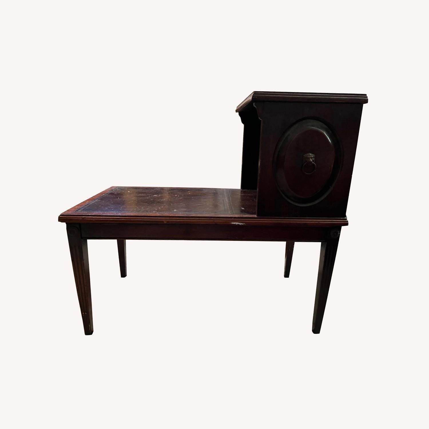 Seller's Notes:Vintage Woodard Furniture two tiered side table. Between 1929’s-1940’s. Leather top