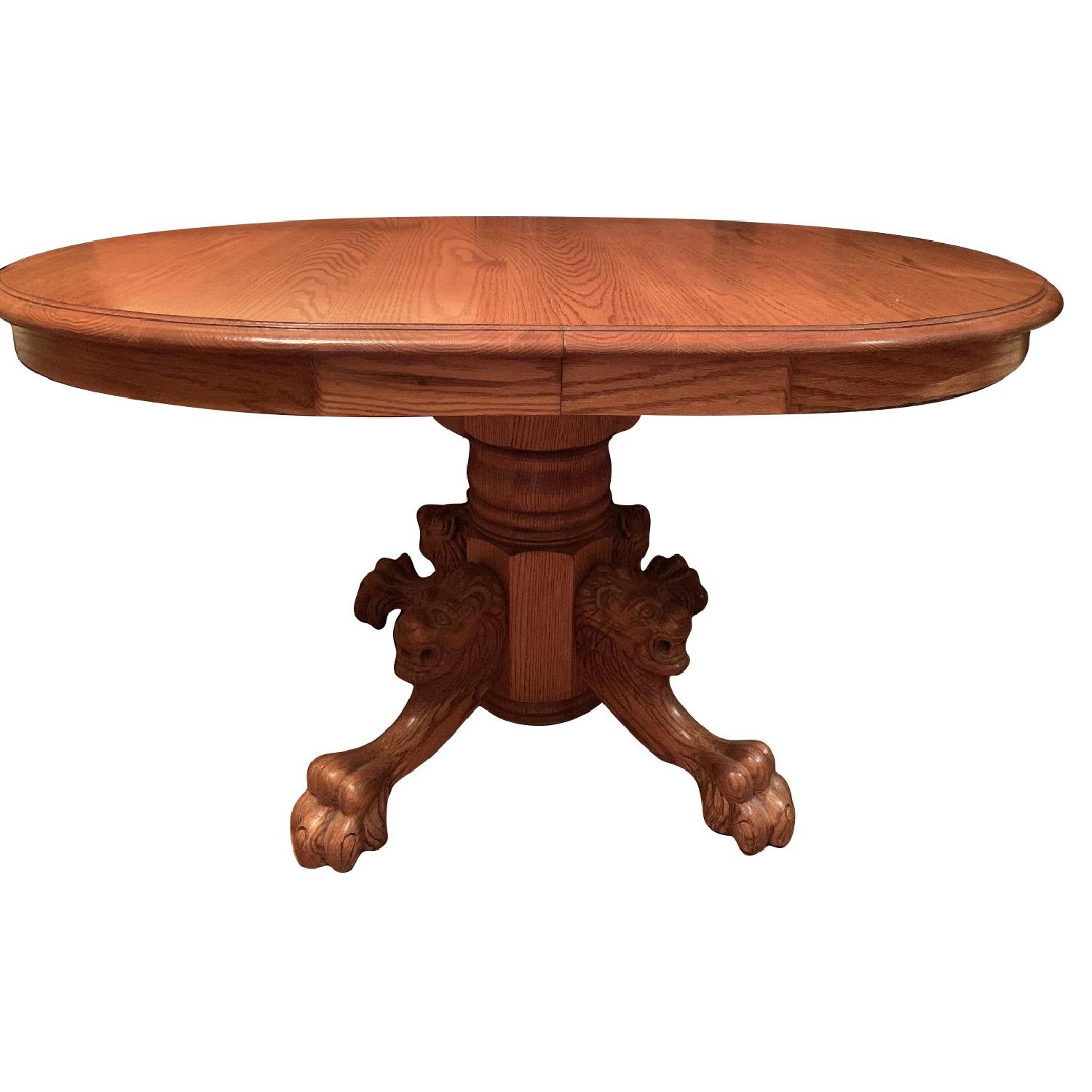 Seller's Notes:Exquisite custom-made Victorian table of solid red oak with two leaves. Lovely brass hardware underneath the table makes inserting and removing the leaves a cinch! When closed, the table seats 6, at 54 x 39 inches. It is 30 inches tall. Fully extended with both leaves, the table seats 10 people, at 90 x 39 x 30 inches. With just one leaf, it seats 8 at 72 x 39 x 30 inches. Each leaf is 18 inches wide, so table extends from 54 to 72 (seats 8) to 90 (seats 10). Base has four custom-carved lion heads. Table is in excellent condition. The leaves have some wear on the edges. This table cost $2,000 new.