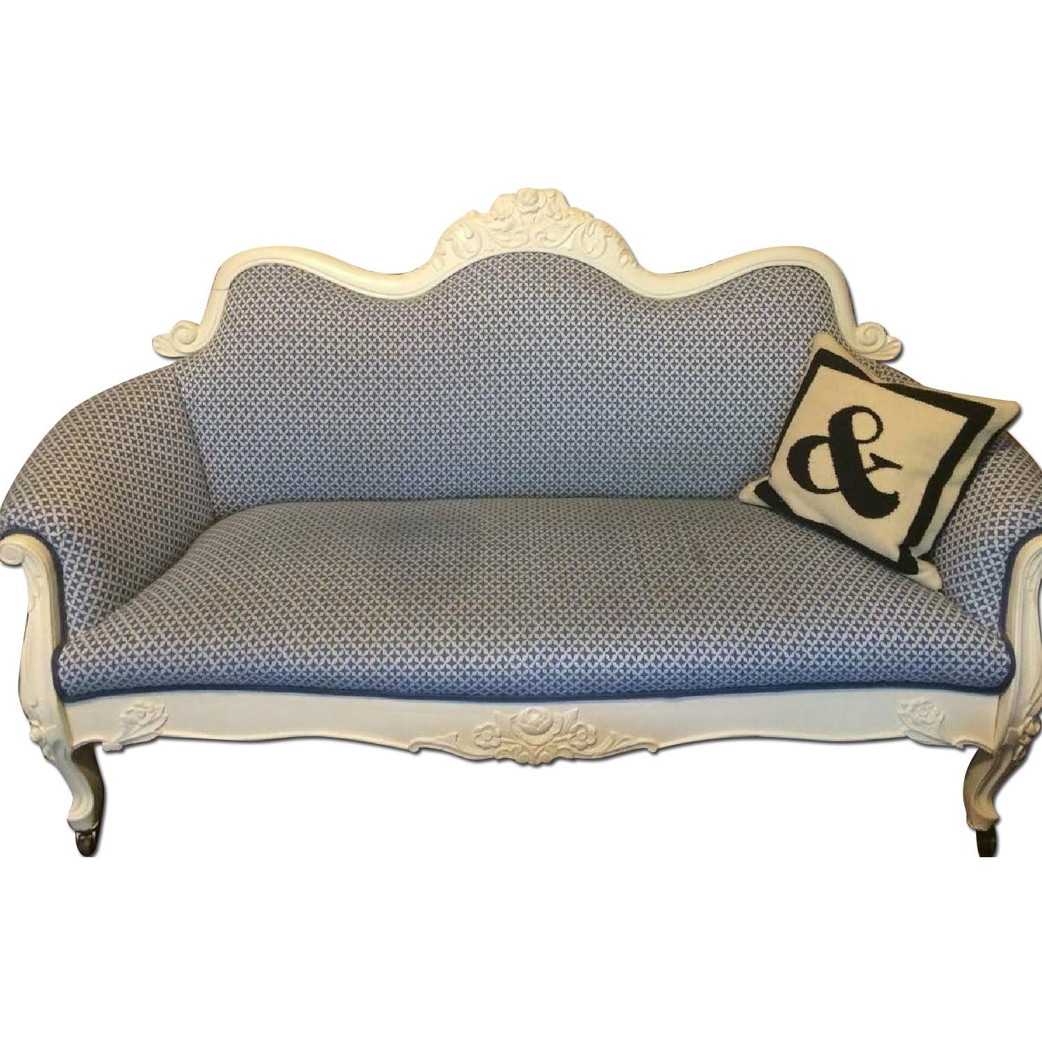 Seller's Notes:Hi there, I am selling a vintage Victorian settee upholstered in a blue-and-white pattern that I purchased from One Kings Lane last summer. It's a beautiful statement piece but doesn't fit so nicely in my new (much smaller) studio. When I bought it, it arrived in excellent condition. I've only had it for 11 months, and the only additional wear and tear is a light olive oil stain (see photo) that can be removed with a professional cleaning (I called a professional to check). It's fading with time, and I didn't think it was worth investing in the cleaning myself since I was selling it anyway. Purchased for $1588.