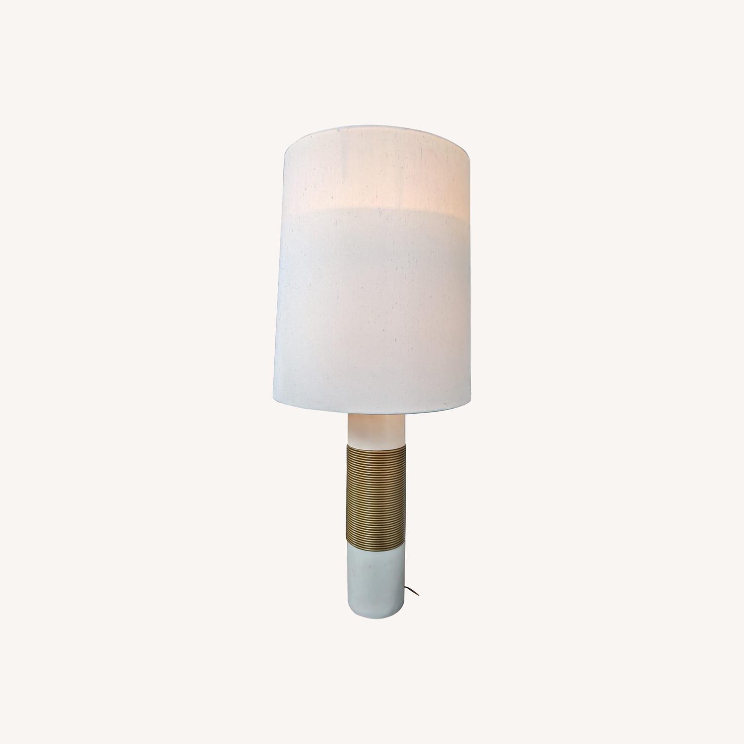 Seller's Notes:Gorgeous & chic, this white/gold lamp adds pizzaz & elegance to any room. Height of base + shade: 35 in Diameter of base: 5 in