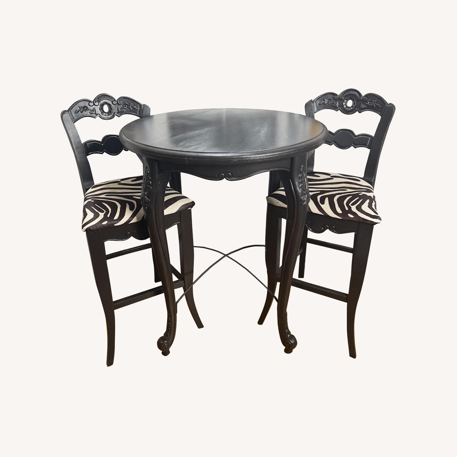 Seller's Notes: Chic black finish & eye catching zebra print seating! Make a bold statement in your dining area with this elegant bar-height dining table and chair set. Crafted from solid black wood, the table features ornate details that give it a timeless, upscale look. The set includes [insert number of chairs] matching chairs, each with plush cushions upholstered in genuine cowhide with a striking zebra print—a perfect blend of sophistication and modern flair. Why you’ll love it: Bar-height design – perfect for creating a casual, yet stylish dining experience. Solid wood construction – built to last for years. Unique zebra print seating – adds a fun, luxurious vibe that stands out. Versatile look – works beautifully in kitchens, dining rooms, or even as a statement piece in an open living space. This set is in great condition and ready to elevate your home décor.