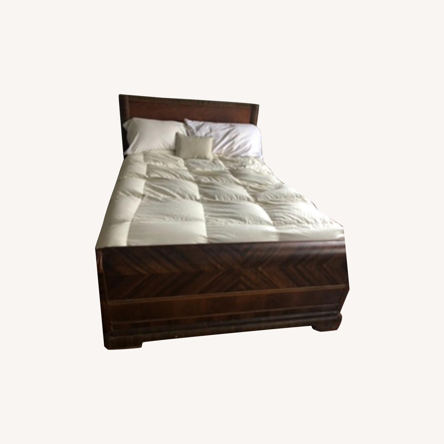 Seller's Notes:A gorgeous antique wood queen bed frame with unique detailing. Ready for something new and hoping to pass this along to a good home. The bed disassembles into headboard, footboard and two side panels for easy transport in an SUV. The slats supporting the bed are a little crude (definitely not original), but they work. Please don’t let this beauty go to waste! Mattress not included- just bed frame and slats. 84" L x 56" W x 40" H