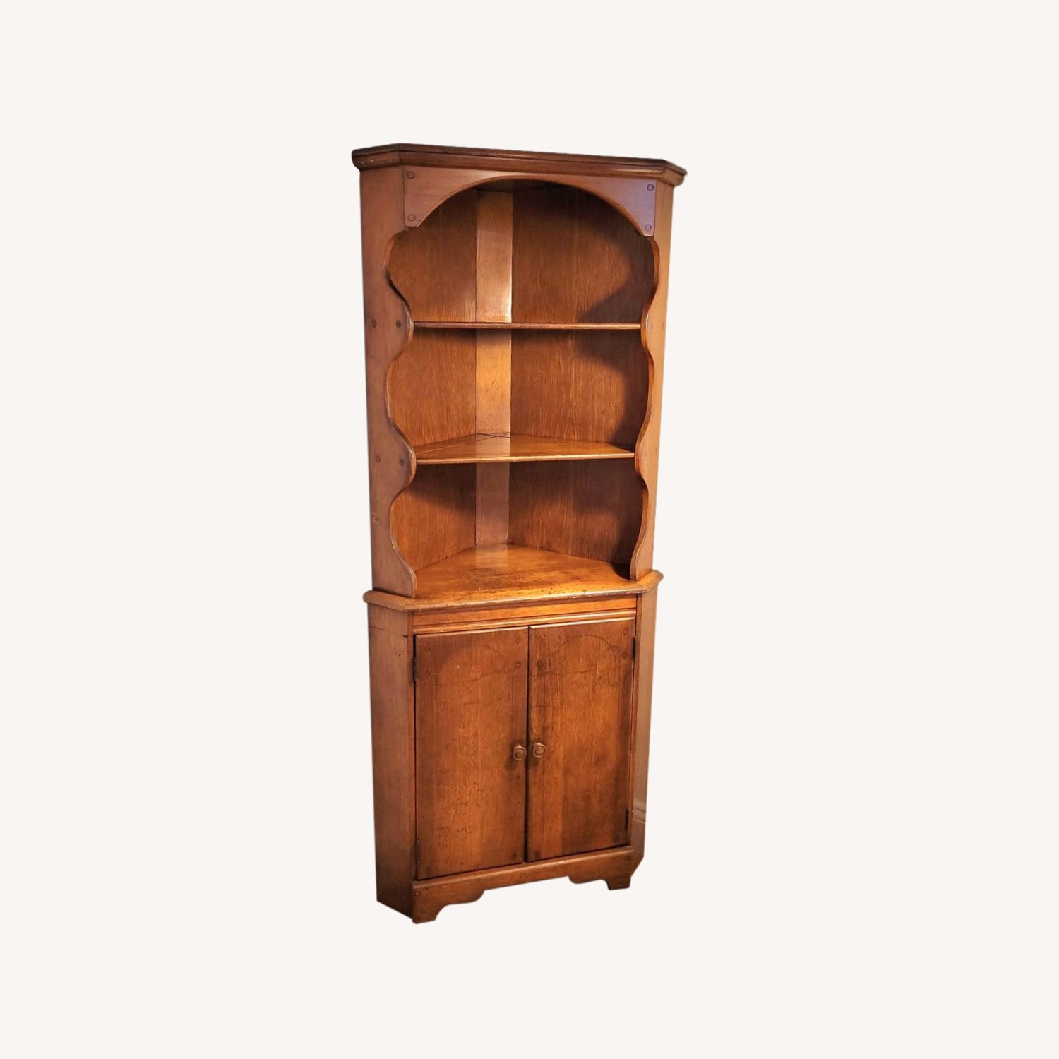 Seller's Notes:This has been in my family for at least 65 years. Three open shelves. Additional storage in bottom portion behind doors. The triangle measures 16" on the sides, 21" on the open side. (It's not precisely a triangle, you can see the shape from the top-down view in the last picture.) Excellent condition other than scratches on the doors. I grew up with this piece, so please give it a good home!