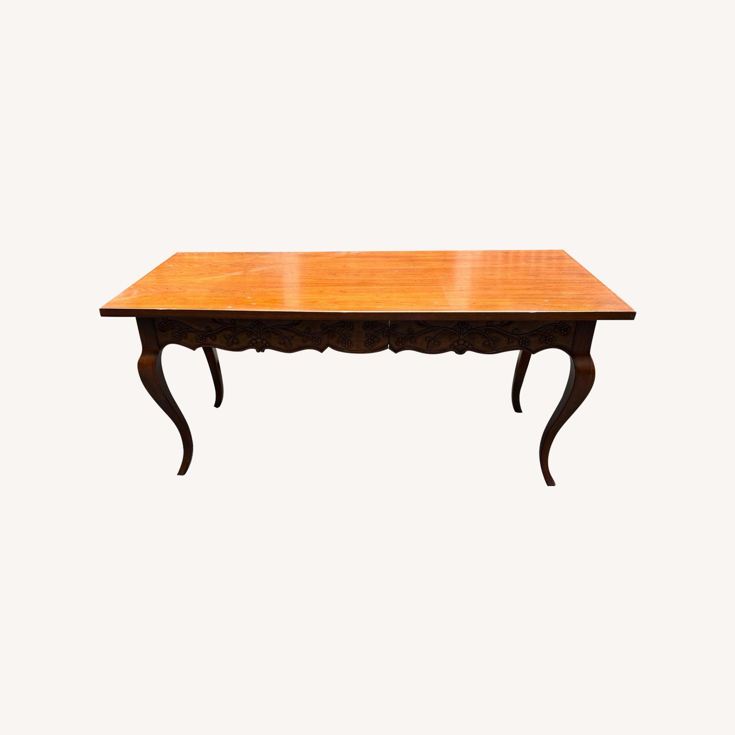 Seller's Notes:Vintage dining set with matching carved ladderback and woven rattan chairs. Custom tie-back cushions included.