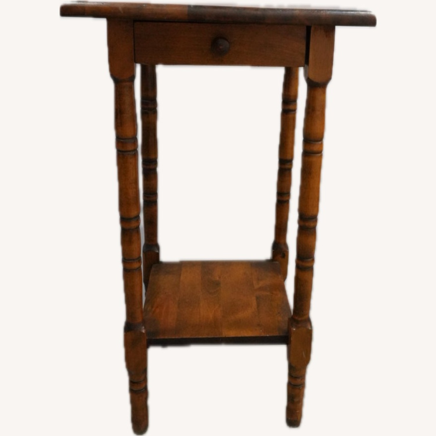 Seller's Notes:Title: Vintage Wooden Side Table — Single Drawer with Lower Shelf Condition: Good vintage condition; sturdy frame with some surface wear consistent with age (see detailed photos). Dimensions: (see above for measurements) Style: Traditional vintage side table Material: Solid wood with turned legs Features: Pull-out drawer + lower shelf Color: Warm medium-brown wood tone Versatility: Works as a bedside table, entryway accent, or living room side table Description: - Charming vintage wooden side table featuring a square top, turned spindle legs, a pull-out drawer with a wooden knob, and a lower shelf for added storage or display - Its warm wood tones and classic design make it a versatile accent piece that blends seamlessly with traditional, rustic, or farmhouse-inspired interiors - Perfectly sized for use as a side table, nightstand, or accent table, this piece combines function with timeless style - The drawer is ideal for small essentials, while the open lower shelf adds extra utility - Perfect for adding warmth and function to bedrooms, living rooms, or cozy reading corners