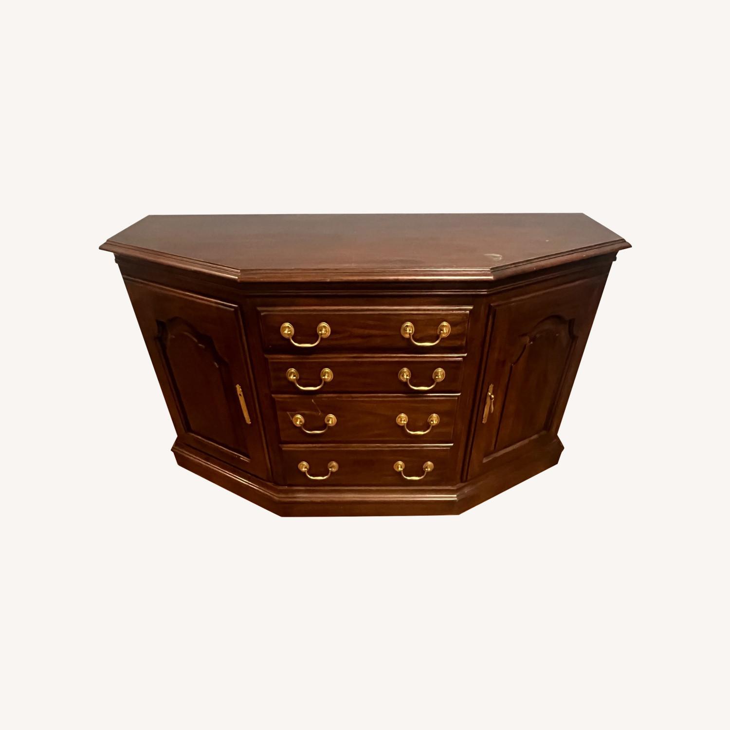 Seller's Notes:Vintage wooden storage cabinet with two side storage compartments and four drawers. In good working condition with a classic vibe. One of the handles for one of the side compartments is missing, and there are some visible scratches and markings on it.