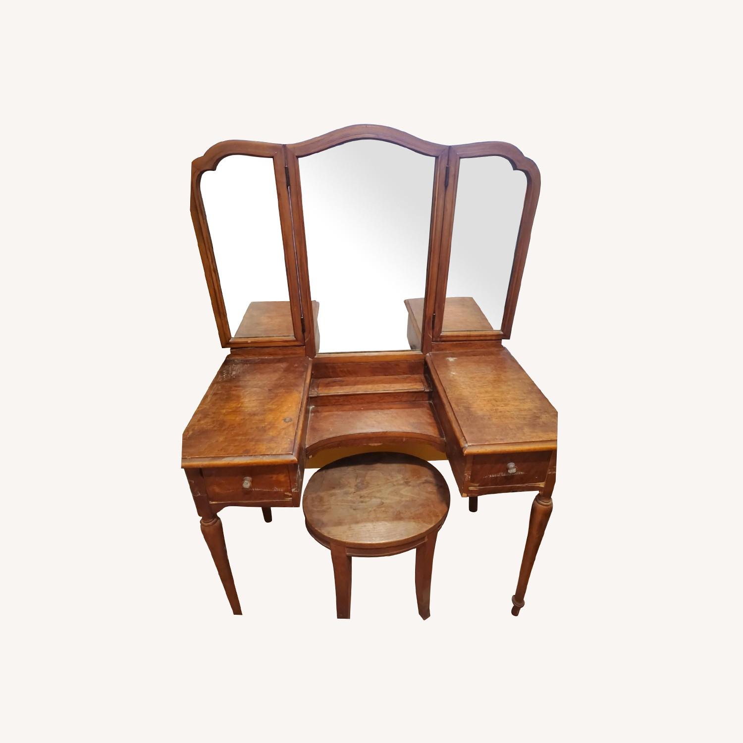 Seller's Notes:Classic wooden vanity with three-panel mirror and stool. 36L x 19W x 30H