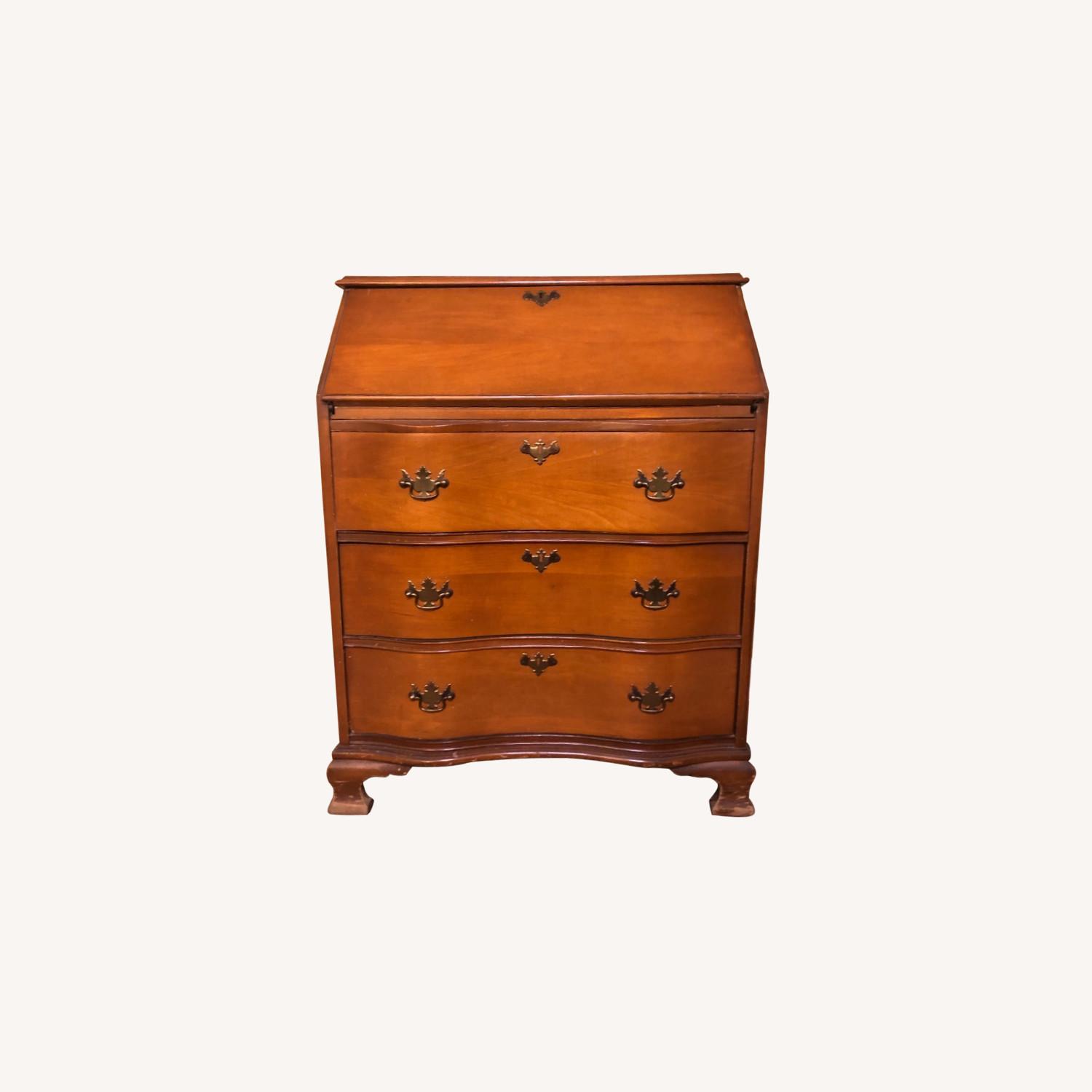 Seller's Notes:This writing desk is a very handsome colonial blonde wood writing desk. It is at least 40+ years. In good condition. Some minor scratches & a slight water mark on top that is easily fixed or covered with a bowl or vase. A handsome piece of furniture. You can make arrangements through AptDeco to have item picked up.