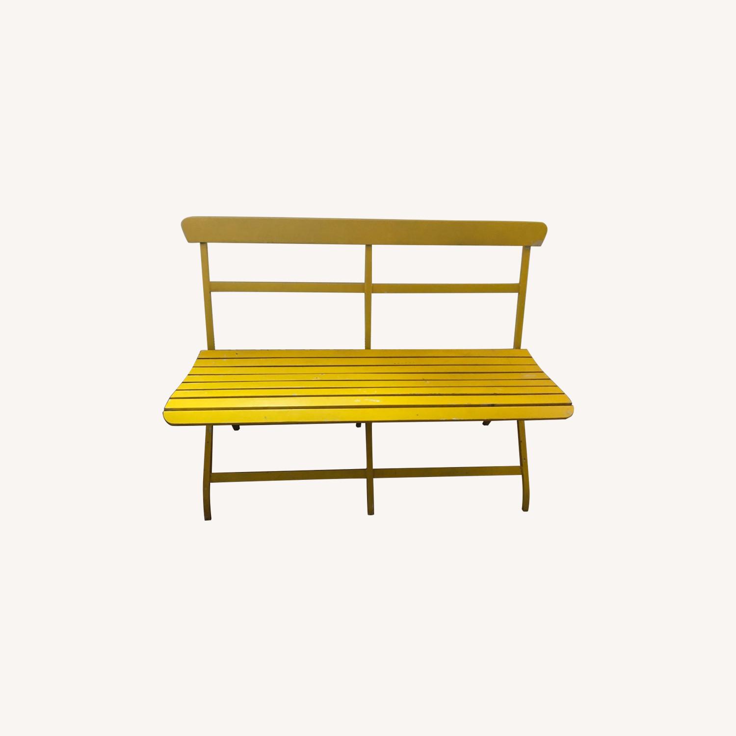 Seller's Notes:Yellow bench purchased at flea markets a few years ago. Doesn't fold, but sturdy. Blemishes galore, very much has the vintage/worn look. Would recommended a power wash. I took this home int he back of a cab, so can fit in a car, or two people could carry it.