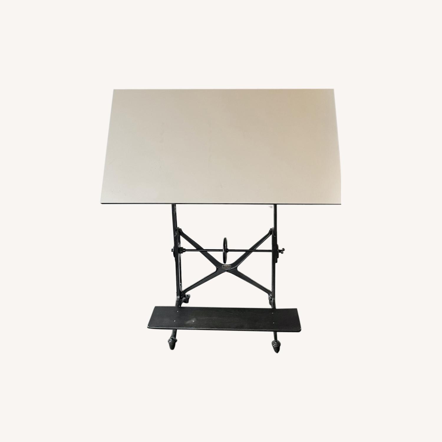 Seller's Notes:This is an antique drafting table that has a special design that allows it to be adjusted in height. The top of the table also has a mechanism that allows adjustment of the table top angle up and down. The table top itself is at the original white laminate with blackened wood edges. The foot rest is also blackened wood. All adjustments are fully functional. We have used this as our dining table for several years and it is a perfect height to use with bar stools. The white laminate top is cleanable, and has some minor wear and tear. This is a beautiful antique piece that is incredibly sturdy and functional.