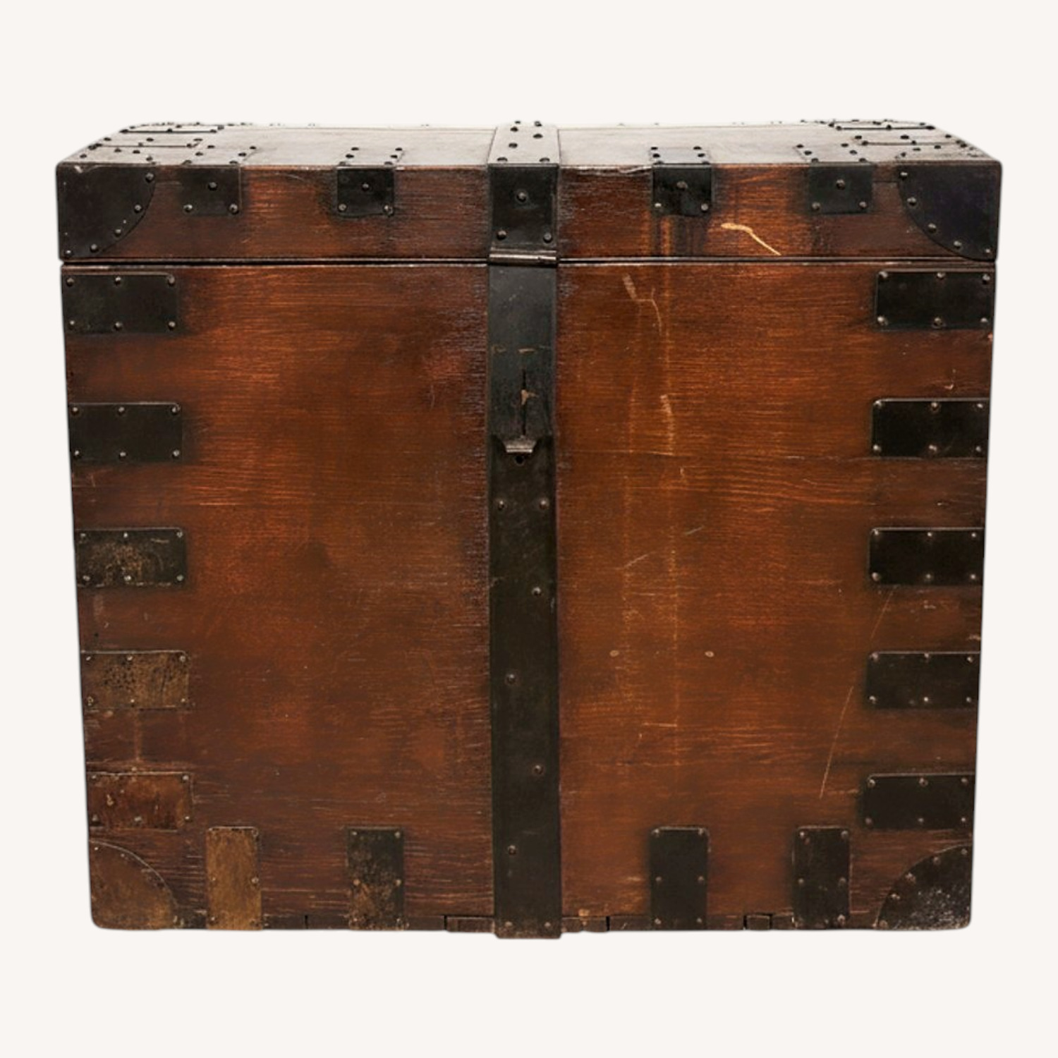 Seller's Notes:Antique English wood + metal ship’s trunk. Large inside, perfect for storage. Bold statement piece with lots of character. Wood is beautiful deep color and corners reinforced by metal. Sides have double metal handles. Condition appropriate for age, it is antique. Too big for my apartment so listing to sell fast. Usually goes for $2-3k on the other sites. Feel free to ask me any questions.